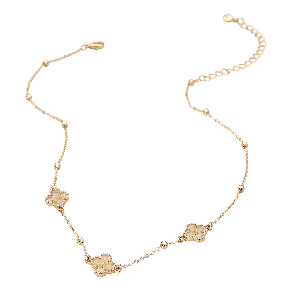 Details • Necklace Size : 16" + 3" L • Decor Size : 0.5" L • Add subtle sparkle to everyday outfits with the Floral Encased Quatrefoil Charm Station Necklace, featuring delicately placed floral accents along a refined chain. Designed for easy layering or solo wear, this necklace offers timeless charm with a light, feminine touch for any occasion. • Lead and Nickel Compliant
