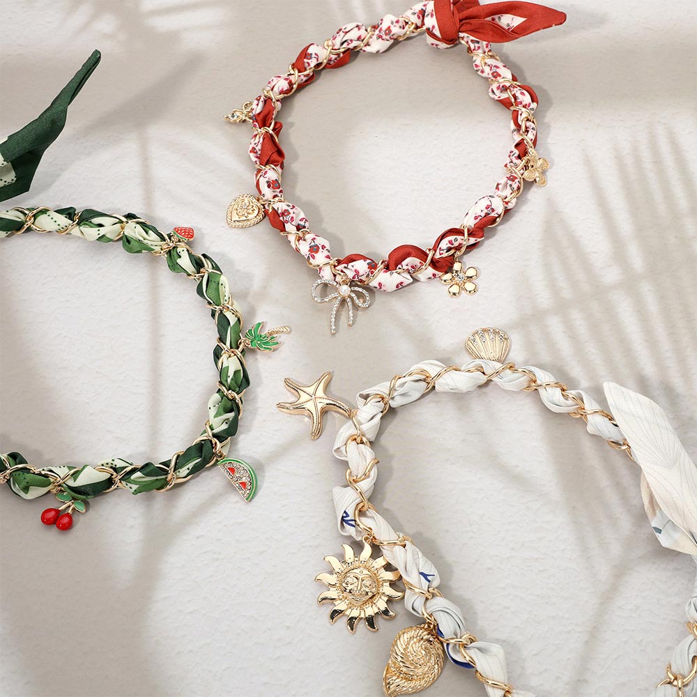 Details • Necklace Size : 27" L • Decor Size : 1.75" L • Earrings Size : 0.2" L • Decorative scarf necklace set featuring layered charm accents and matching stud earrings for a coordinated statement look. Designed to add visual interest and movement, this fashion accessory is ideal for boutiques, seasonal collections, gifting displays, and trend-driven assortments that highlight feminine and playful styling. • Lead and Nickel Compliant