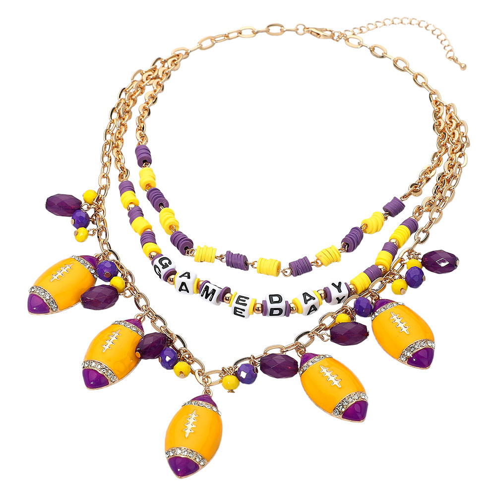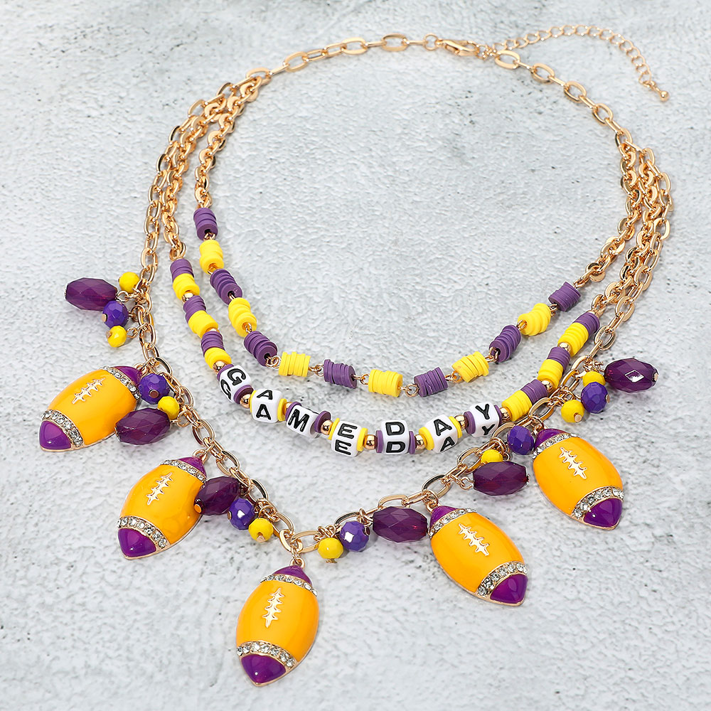 Details • Necklace Size : 16.5" + 3" L • Decor Size : 3.5" L • Layered necklace featuring football charms, gameday letter beads, and playful accents. A spirited accessory to show team pride, add energy to gameday looks, and complete fan outfits with fun layered style. • Lead and Nickel Compliant