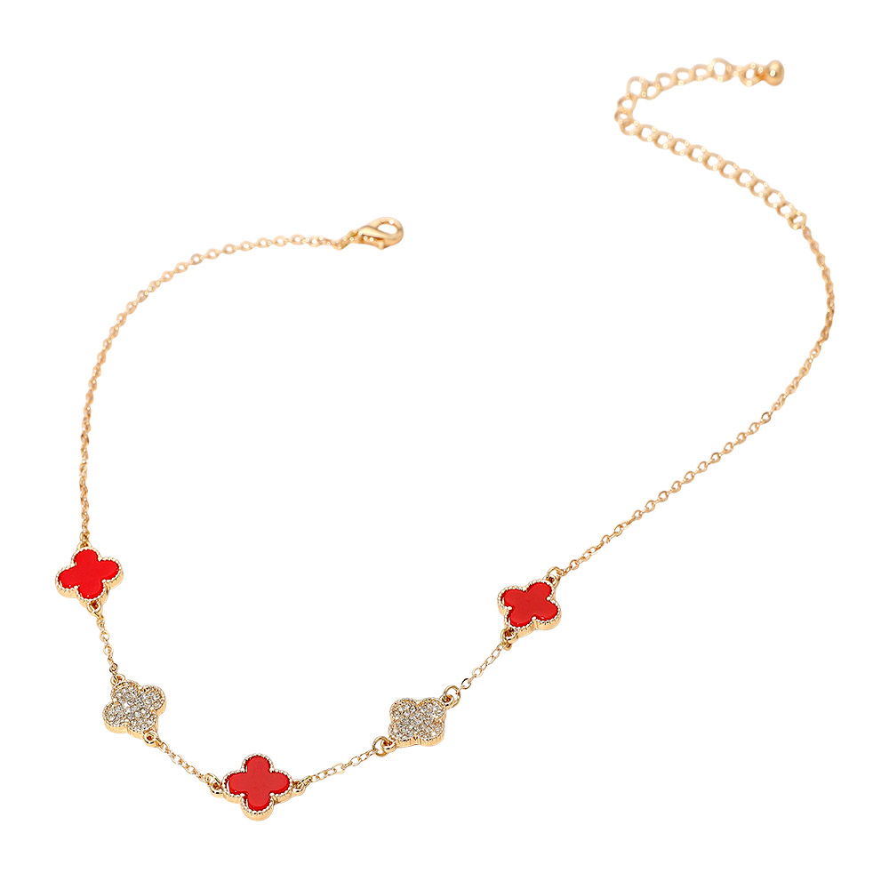 Details • Necklace Size : 15.5" + 3" L • Decor Size : 0.5" L • Add refined elegance to any outfit with this clover charm necklace featuring alternating enamel and crystal-accented charms. Designed with a sleek chain and timeless motif, it’s a versatile piece that complements both casual and dressy looks with effortless sophistication. • Gold Dipped • Lead and Nickel Compliant