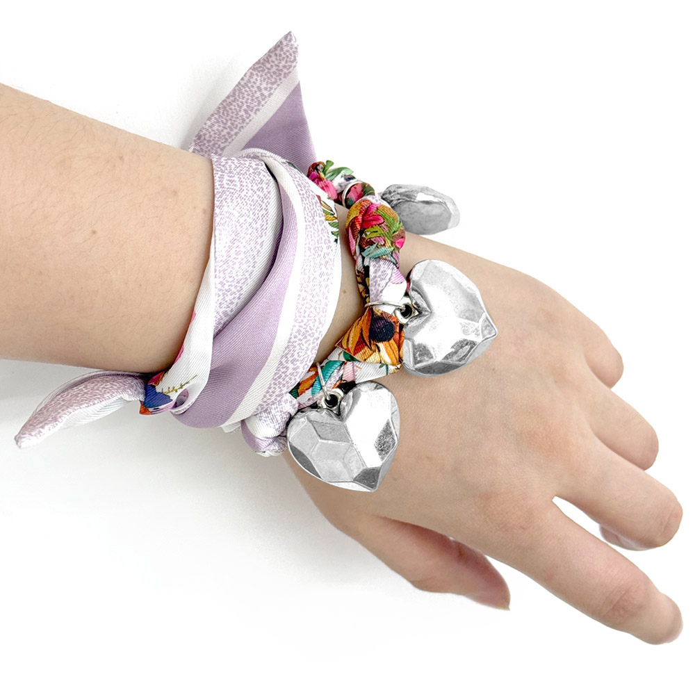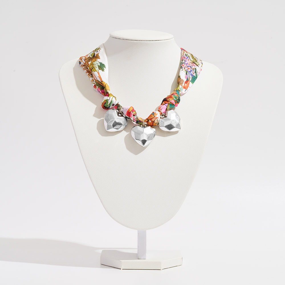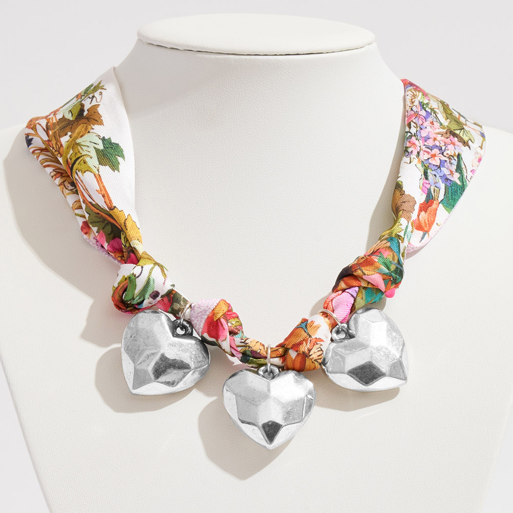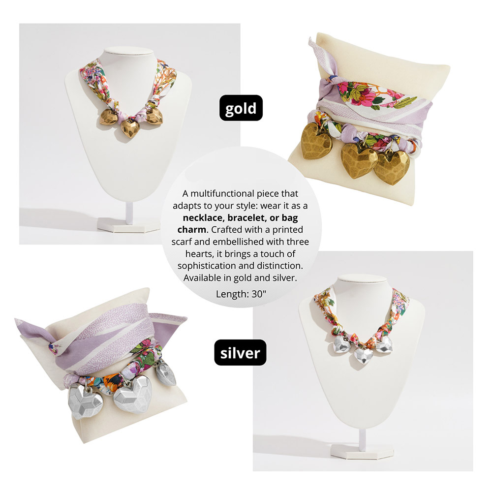 • A versatile accessory that can be styled as a necklace, bracelet, or bag charm. Featuring a printed scarf adorned with three bold heart pendants, it adds elegance and personality. Available in gold or silver, this multifunctional design enhances any look with sophistication.