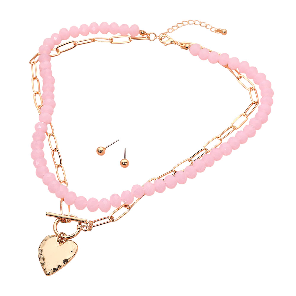 Hammered Metal Heart Toggle Pendant Accent Paperclip Beaded Chain Layered Necklace