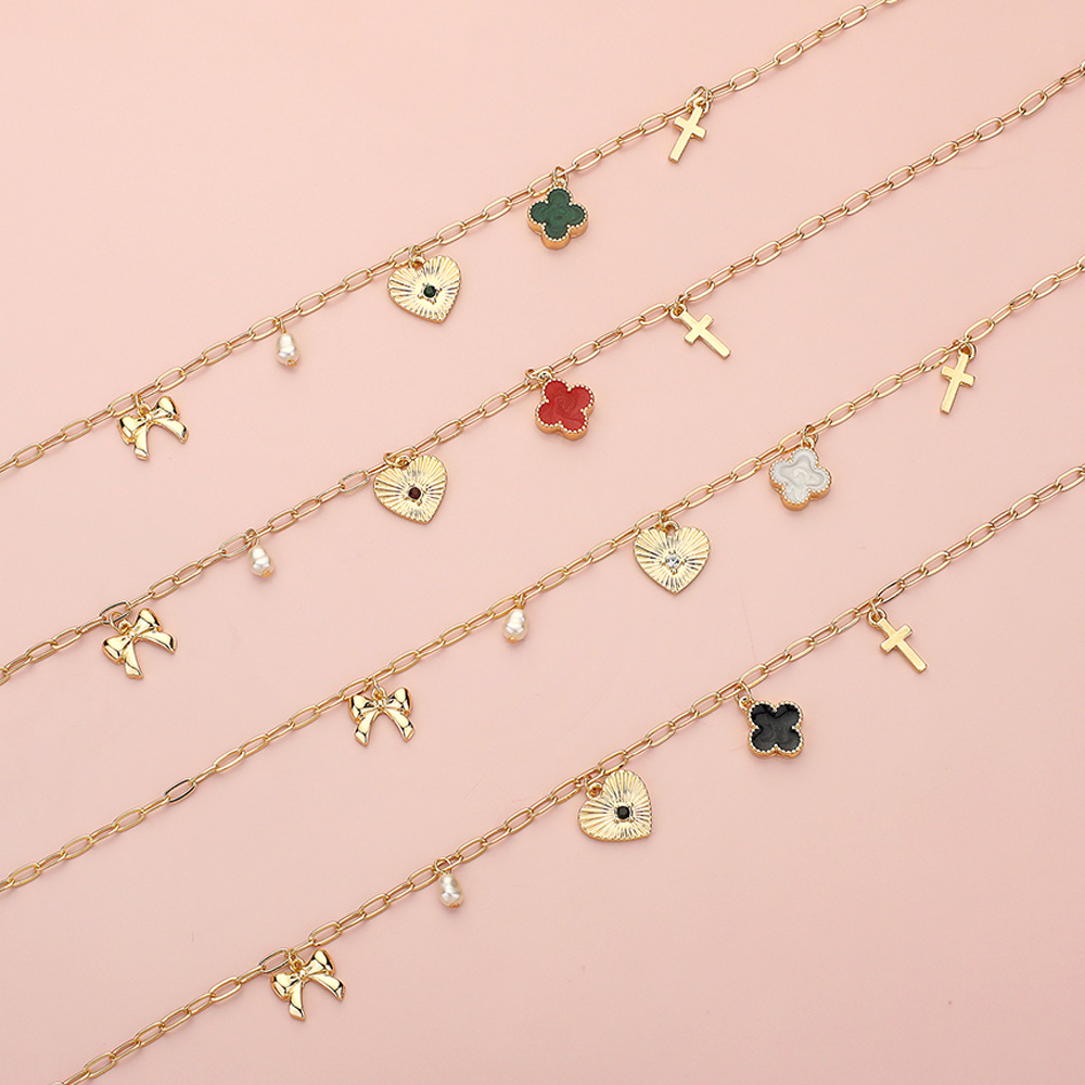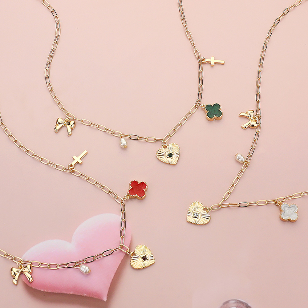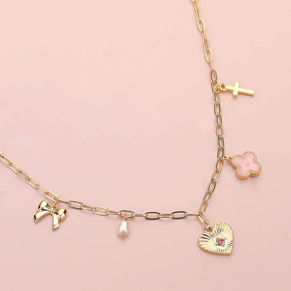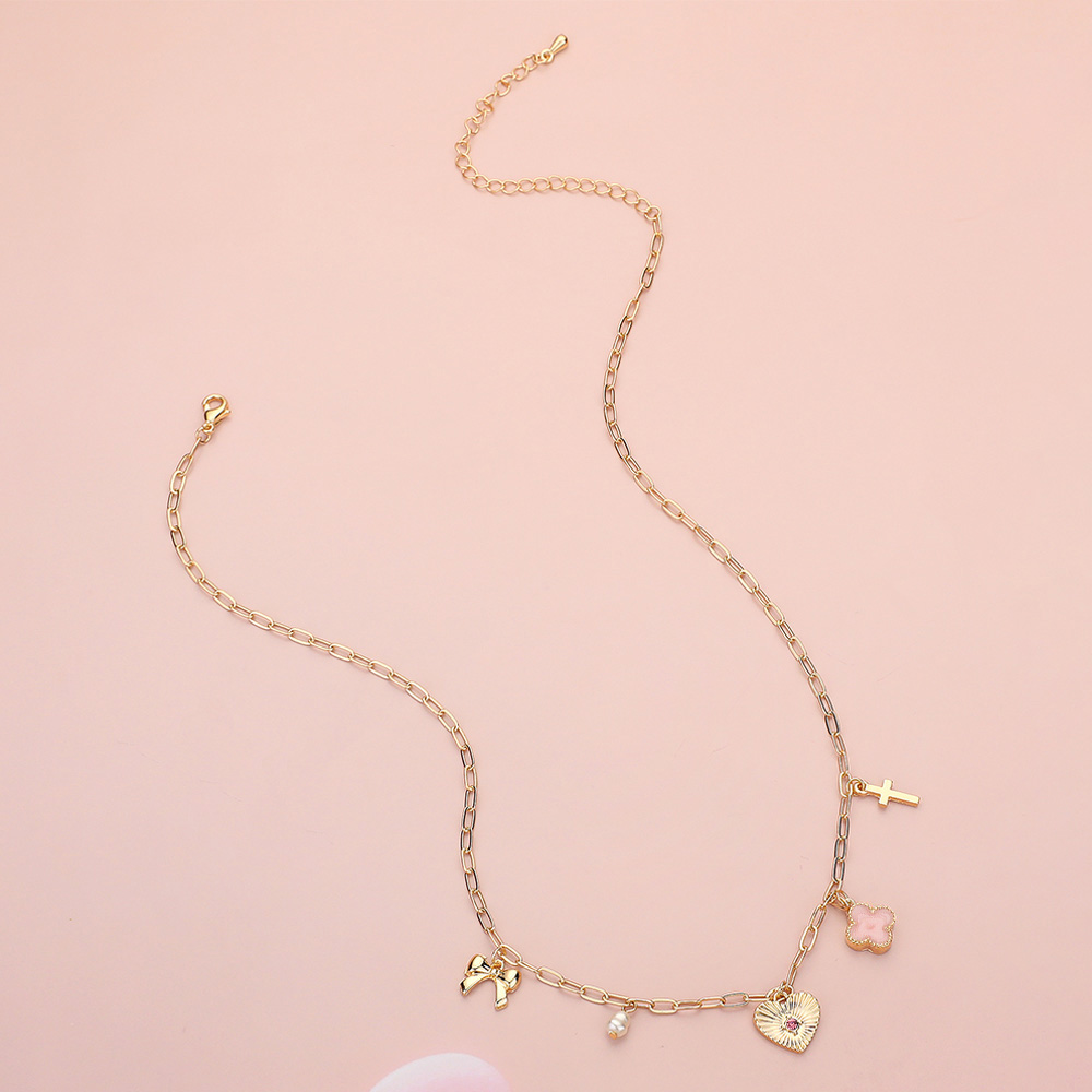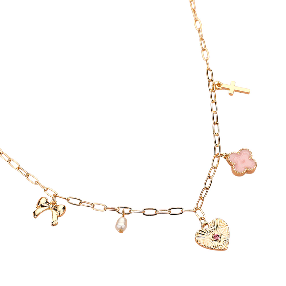Heart Bow Pearl Quatrefoil Cross Charm Station Paperclip Chain Necklace