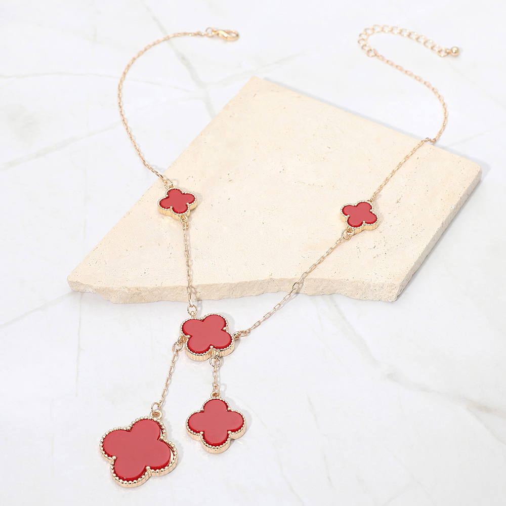 Details • Necklace Size : 16" + 2" L • Decor Size : 3" L • Stylish necklace featuring multiple quatrefoil pendants in a cascading layered design. The elegant drop detail adds movement and sophistication, making it perfect for both casual and formal wear, offering a timeless charm that enhances any outfit effortlessly. • Lead and Nickel Compliant