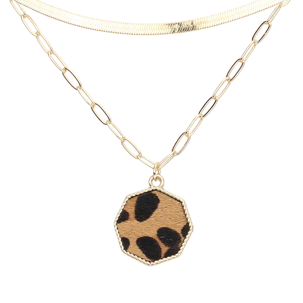 Cheetah Patterned Genuine Leather Octagon Pendant Double Layered Necklace