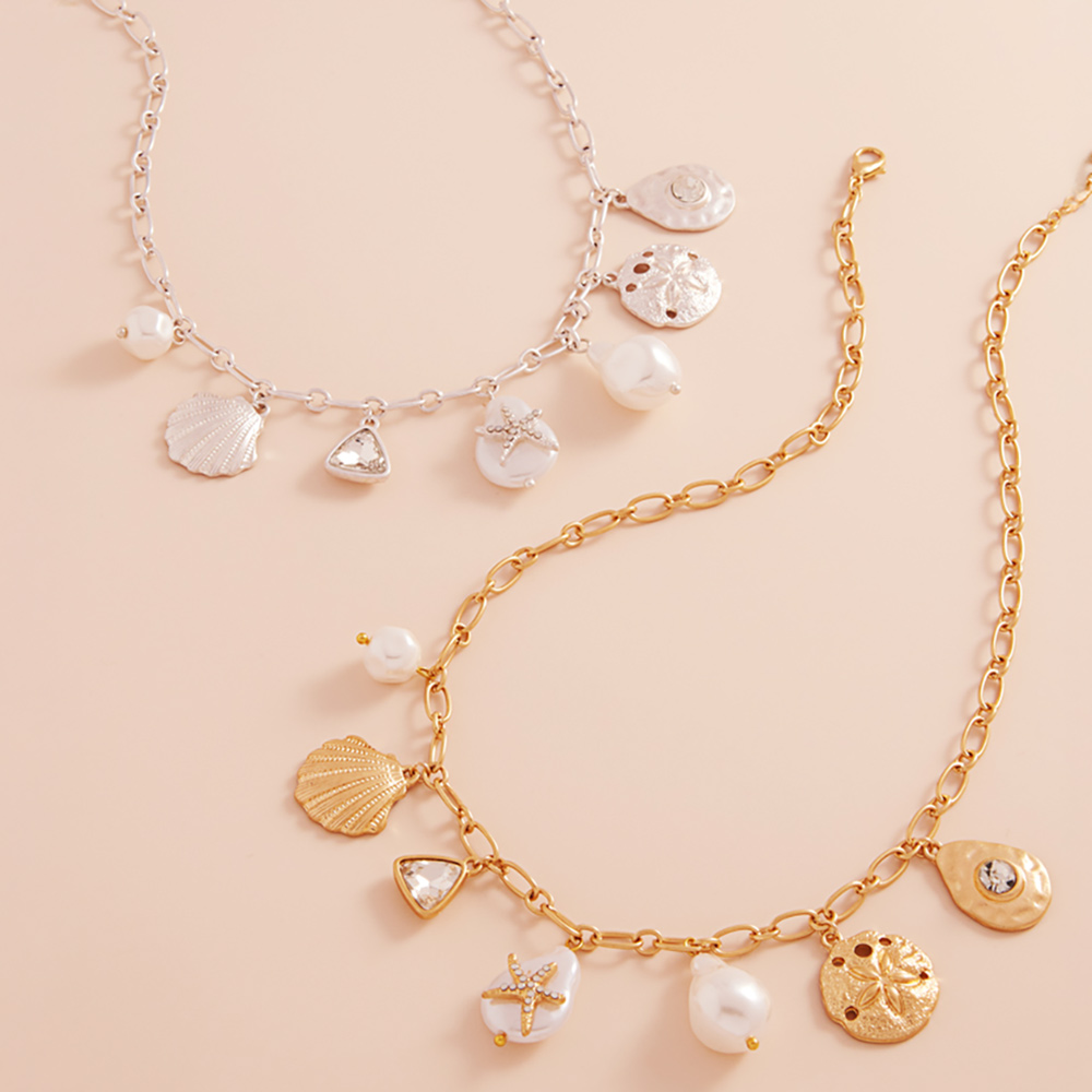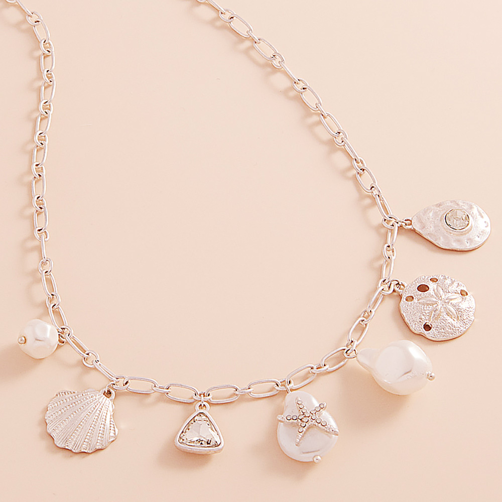 Details • Necklace Size : 17" + 3" L • Decor Size : 1" L • Delicate charm necklace featuring shell and beach-inspired pendants for a playful coastal vibe. Perfect for adding a touch of seaside elegance to casual and vacation outfits, making it a charming accessory for any jewelry collection. • Lead and Nickel Compliant