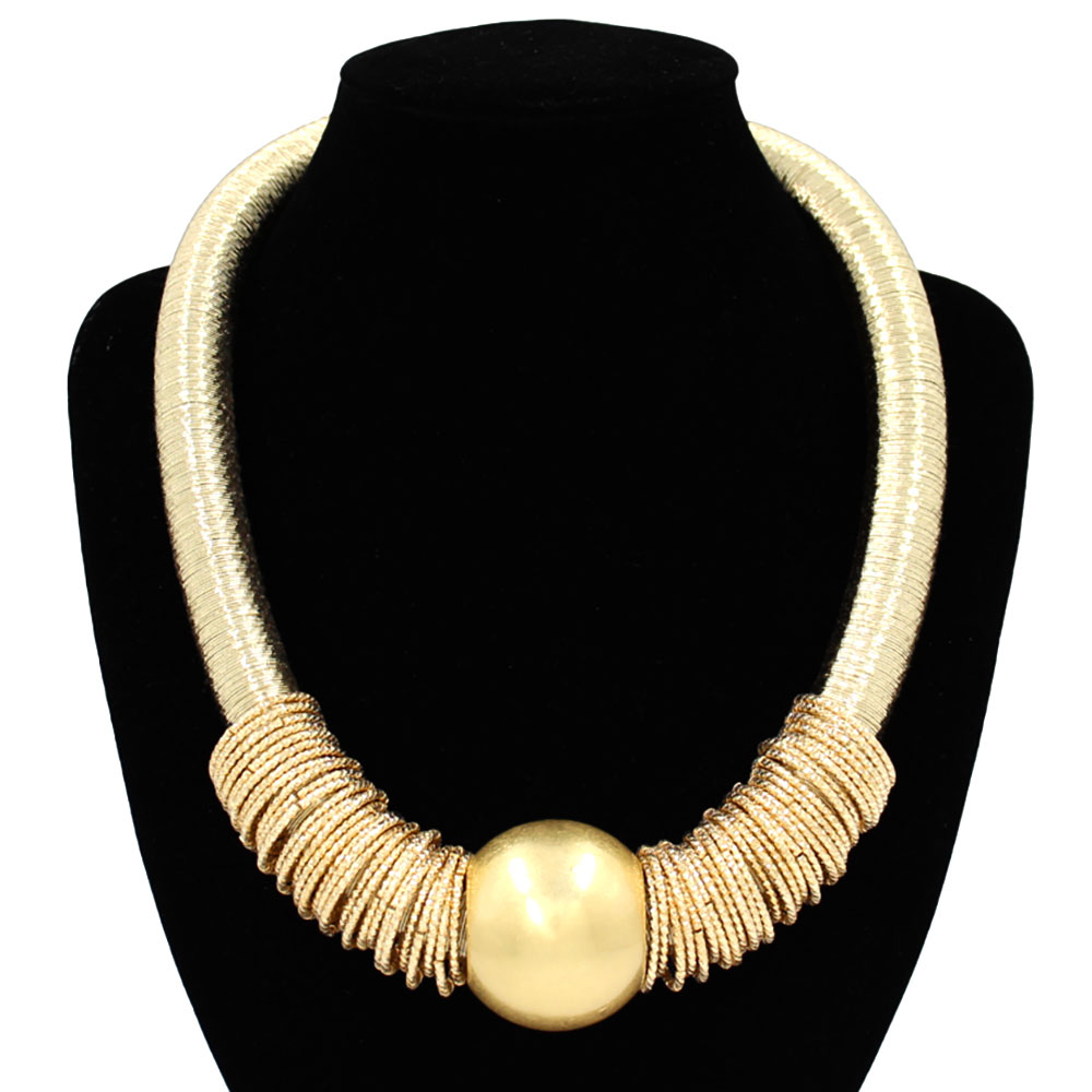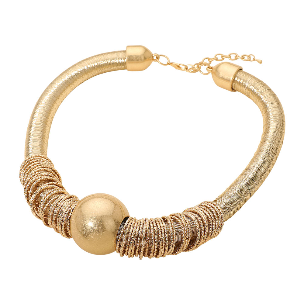 Details • Size : 21" + 3"L • Decor Size : 1.5" L • Showcase your bold style with the Modern Metallic Coil Necklace, featuring a central polished bead framed by stacked ring accents. This sculptural piece blends contemporary elegance with a high-fashion edge, perfect for elevating evening wear or adding glamour to any outfit. • Lead and Nickel Compliant
