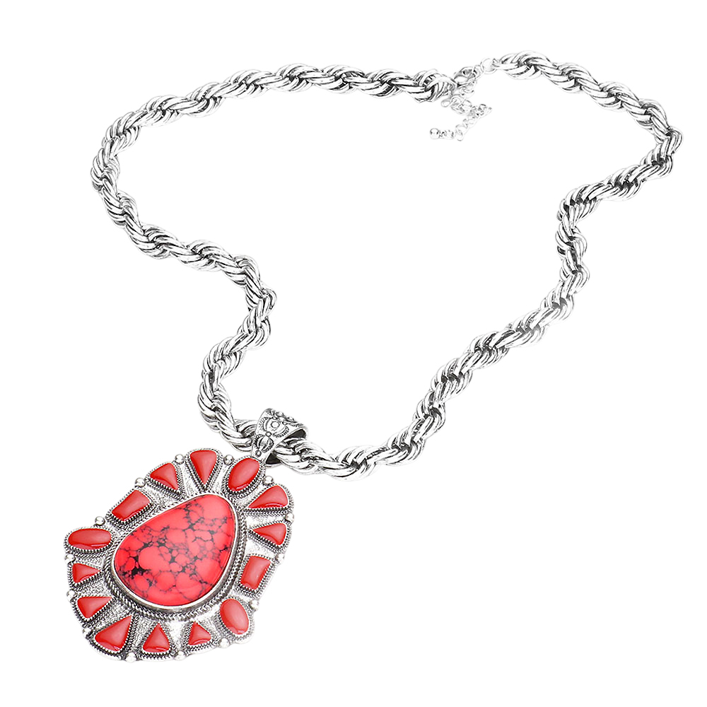 Natural Stone Centered Antique Metal Pendant Necklace