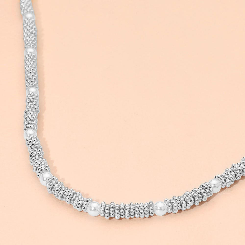 Pearl Accent Textured Metal Tube Beaded Necklace
