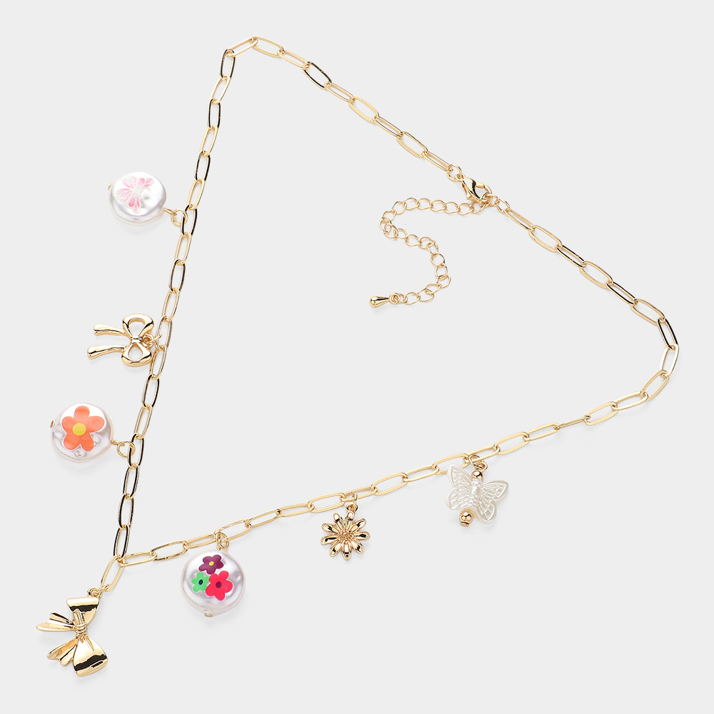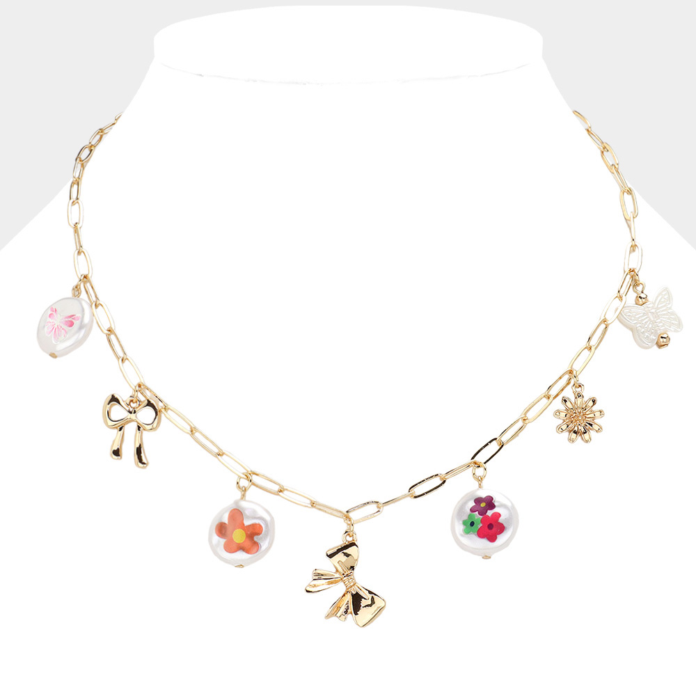 Pearl Bow Flower Charm Station Paperclip Chain Necklace