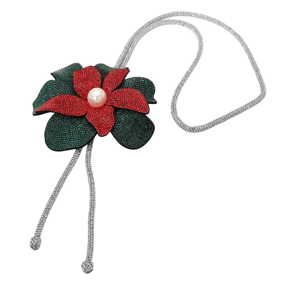 Pearl Centered Bling Studded Flower Pointed Bolo Tie Necklace