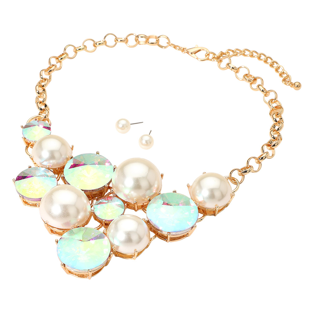 Details • Necklace Size : 19" + 3" L • Decor Size : 3.5" L • Earrings Size : 0.4" L • This elegant statement necklace features lustrous pearl-like accents paired with shimmering gemstones for a radiant finish. Complete with matching stud earrings, it offers a perfect blend of sophistication and glamour, ideal for weddings, galas, or upscale evening looks. • Lead and Nickel Compliant