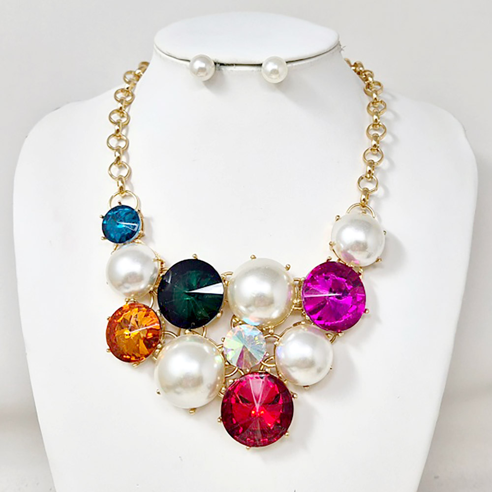 Details • Necklace Size : 19" + 3" L • Decor Size : 3.5" L • Earrings Size : 0.4" L • This elegant statement necklace features lustrous pearl-like accents paired with shimmering gemstones for a radiant finish. Complete with matching stud earrings, it offers a perfect blend of sophistication and glamour, ideal for weddings, galas, or upscale evening looks. • Lead and Nickel Compliant