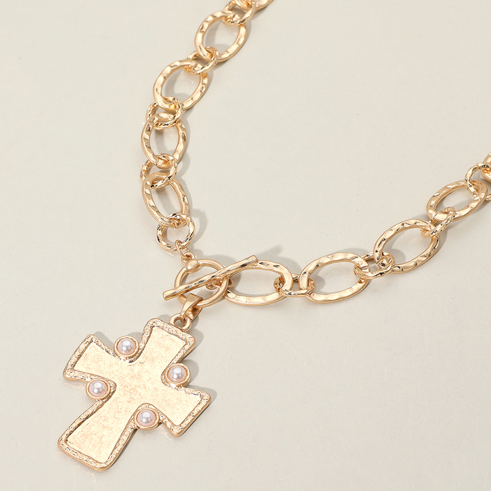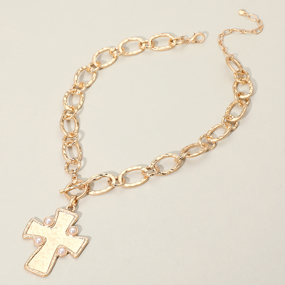 Details • Necklace Size : 16" + 3.5" L • Pendant Size : 1.5" X 2.75" • Bold chunky chain necklace featuring a standout cross pendant with smooth detailing and subtle accents. Designed with an easy toggle closure for stylish everyday wear. A statement accessory that adds a modern touch to layered looks or can be worn solo for a striking finish. • Lead and Nickel Compliant