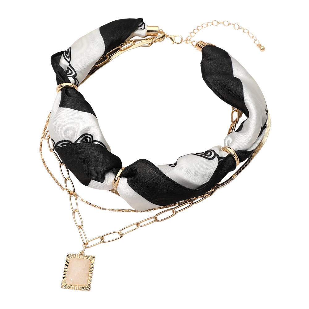 Rectangular Stone Pendant Accent Layered Fabric Scarf Necklace