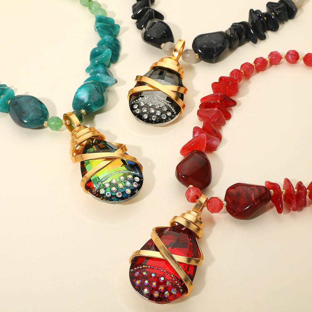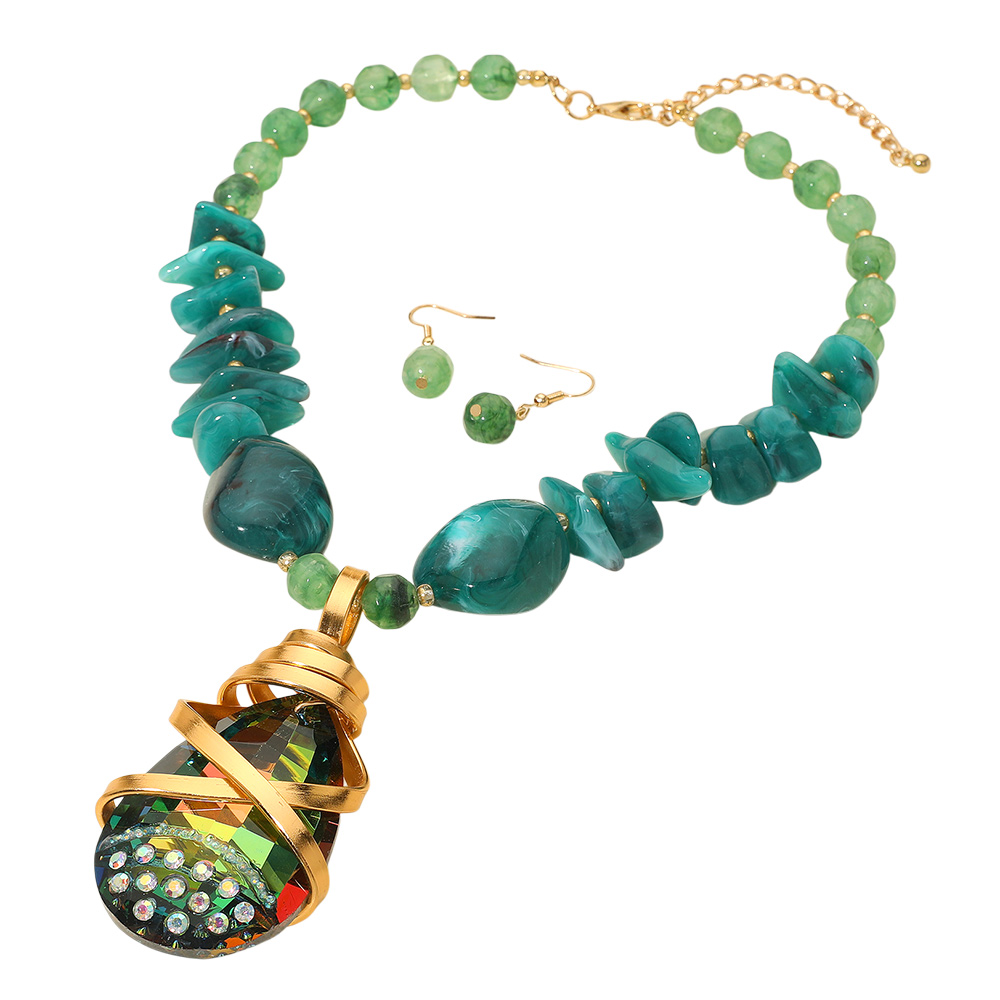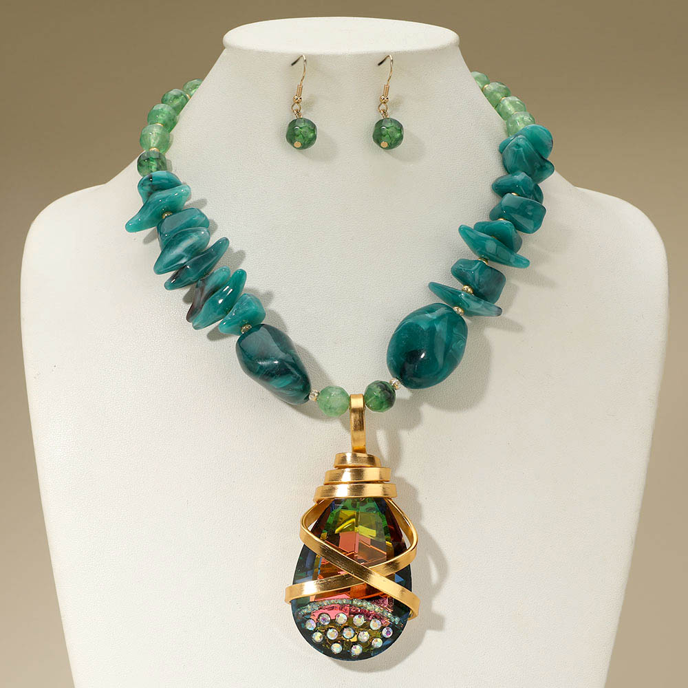 Details • Necklace Size : 18.5" + 3.25" L • Decor Size : 3.7" L • Earrings Size : 1.3" L • Turn heads with this striking beaded statement necklace, featuring an artistic pendant wrapped in metallic accents and paired with matching earrings. Ideal for special occasions or elevating everyday outfits, this set blends bold style with artistic flair for a standout look. • Lead and Nickel Compliant