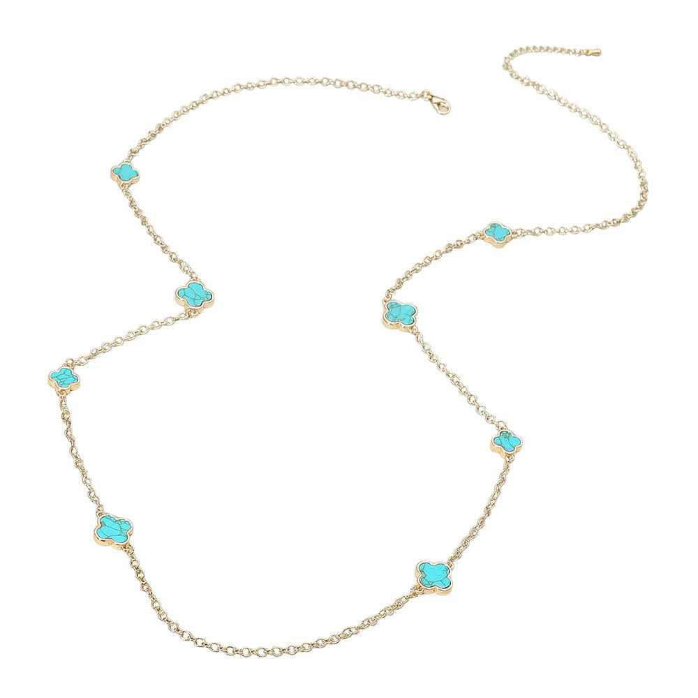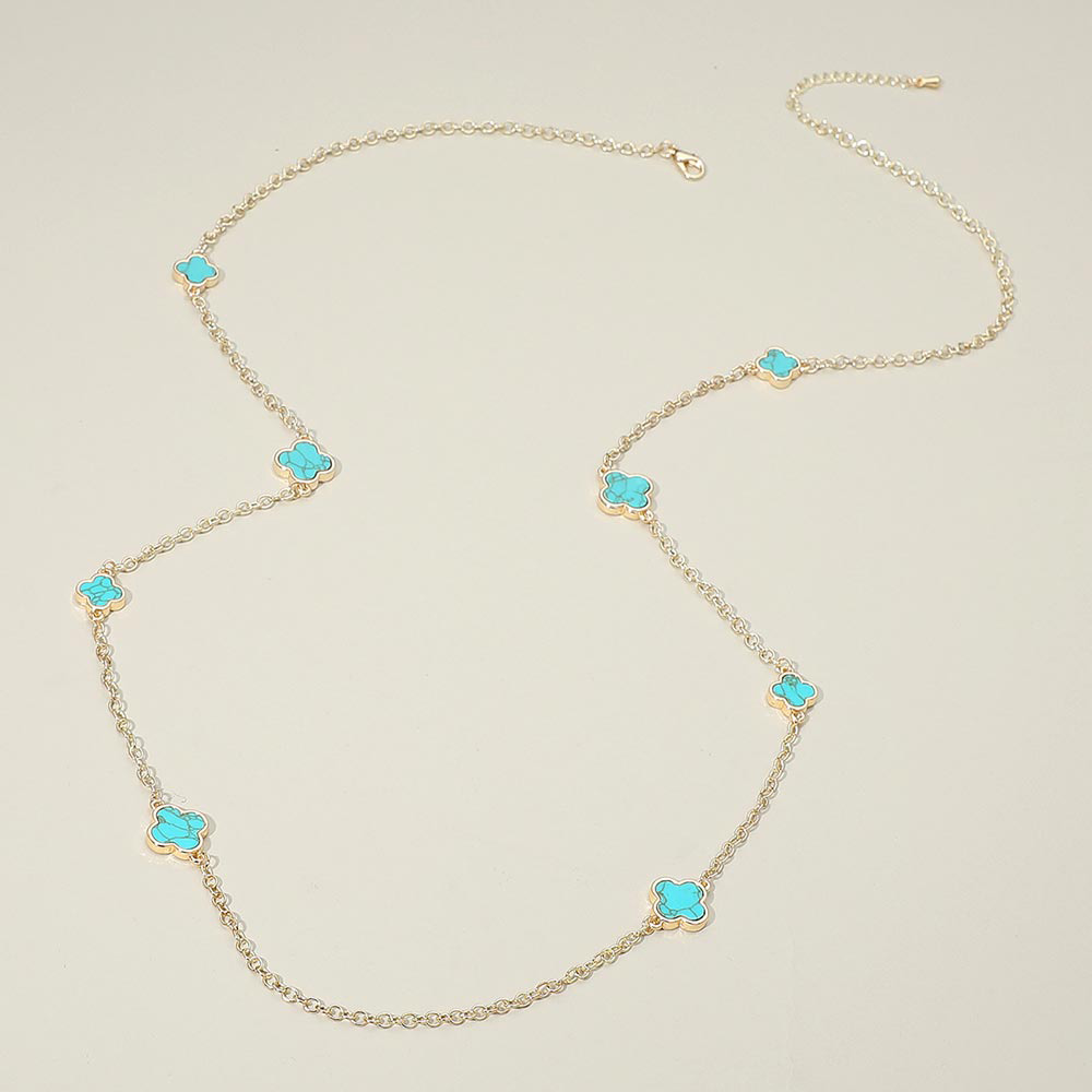 14K Gold Plated Turquoise Quatrefoil Motif Station Long Necklace