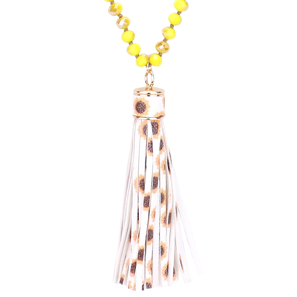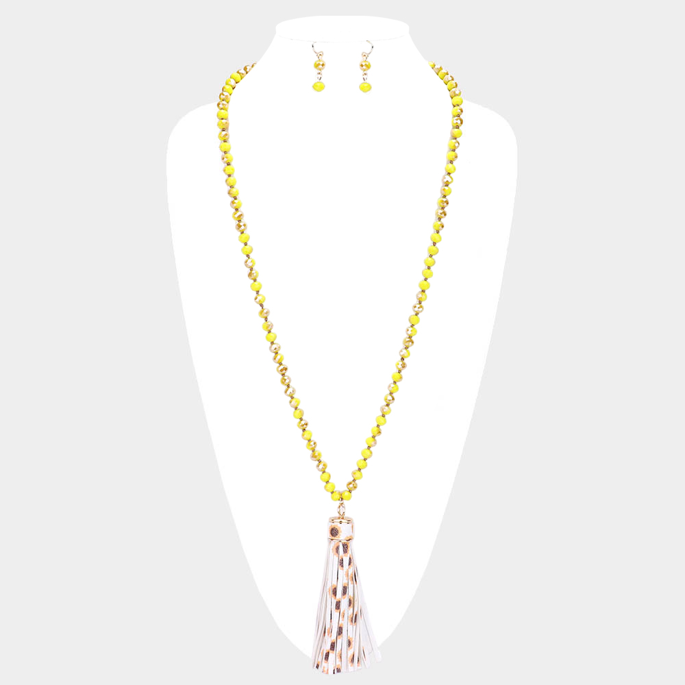 Faux Leather Tassel Faceted Bead Long Necklace