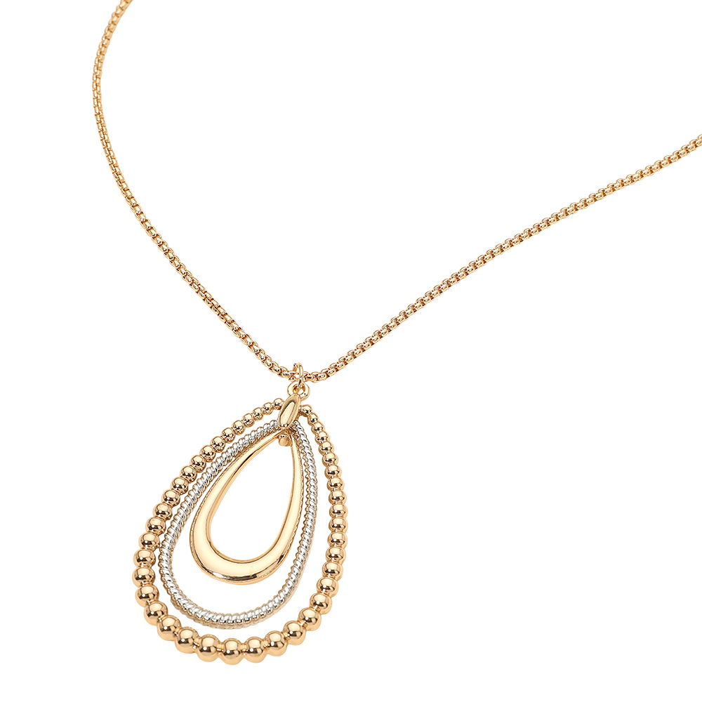 Details • Necklace Size : 34.5" + 3.5" L • Pendant Size : 1.4" X 2.25" • Showcases layered open teardrop pendants with mixed textures that create depth and elegant movement. A refined statement piece designed to elevate everyday looks and complement evening or special-occasion outfits. • Lead and Nickel Compliant