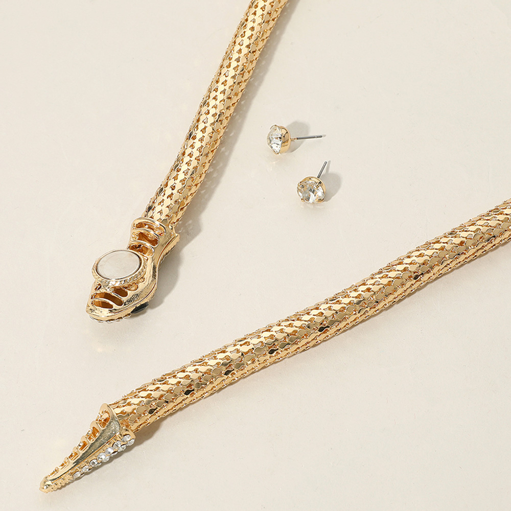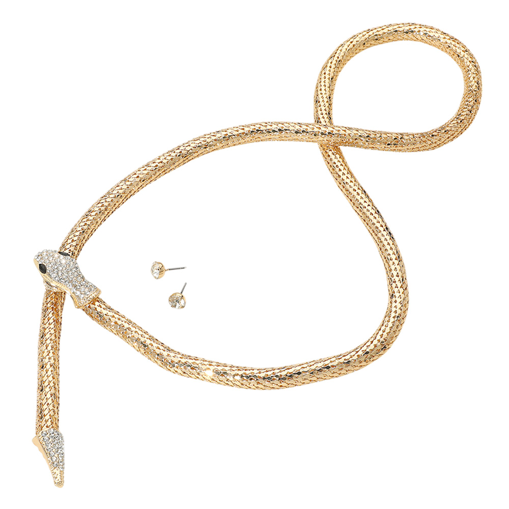 Details • Necklace Size : 38" L • Decor Size : 0.7" L • Earrings Size : 0.3" L • Magnetic Closure • Bold snake chain necklace with shimmering head detail, paired with matching stud earrings. A fierce and stylish set perfect for making a striking fashion statement. • Lead and Nickel Compliant