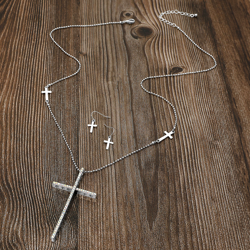 Details • Necklace Size : 29" + 3" L • Pendant Size : 1.75" X 3.25" • Earrings Size : 1" L • Minimalist necklace and earring set featuring cross pendants on a delicate chain, perfect for adding subtle meaning and style to everyday looks. This elegant set offers a refined touch, ideal for layering or wearing as a simple statement piece. • Lead and Nickel Compliant