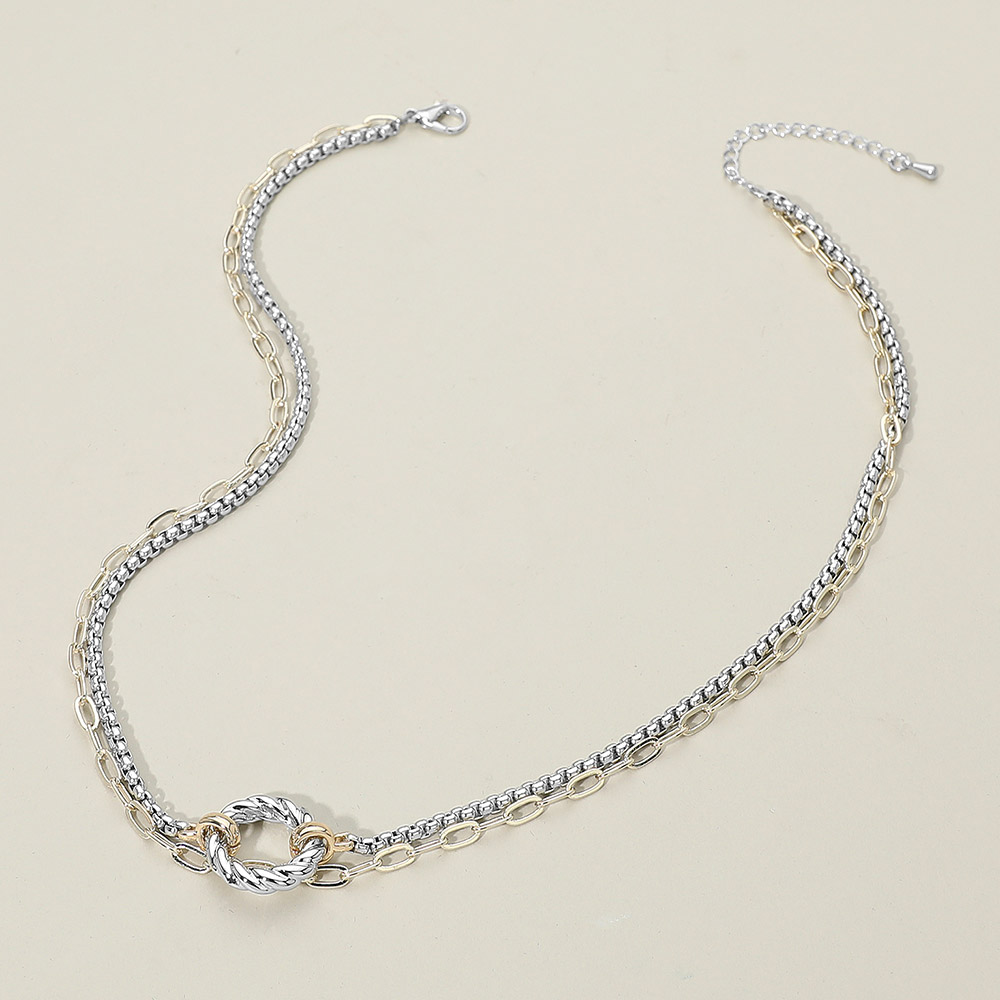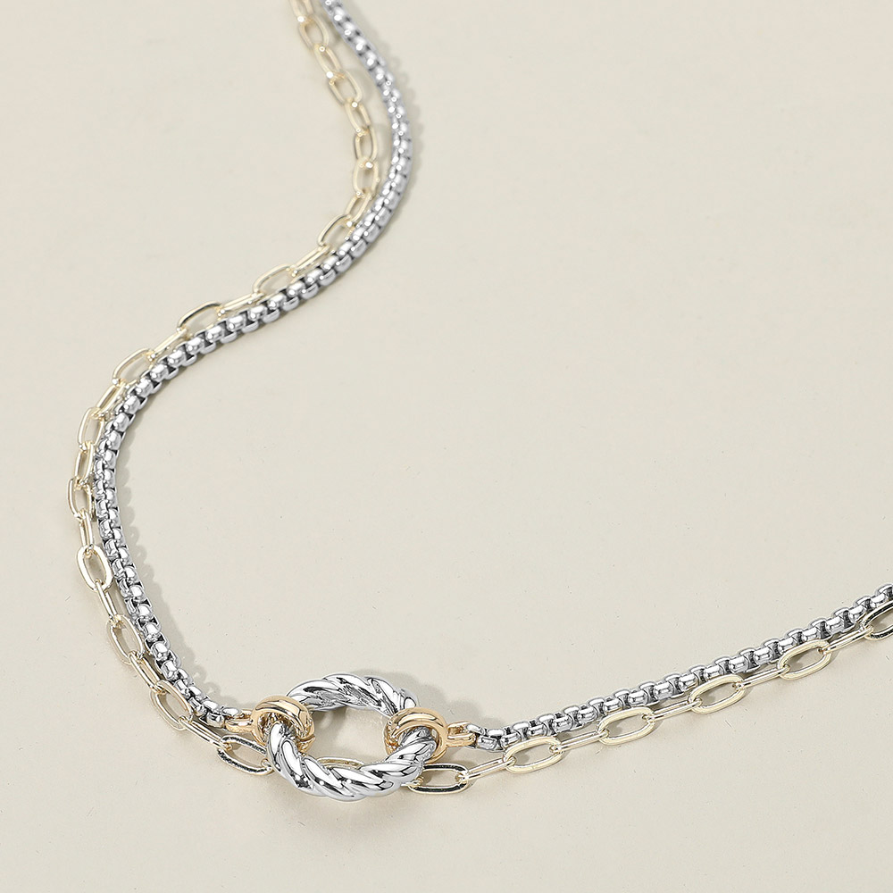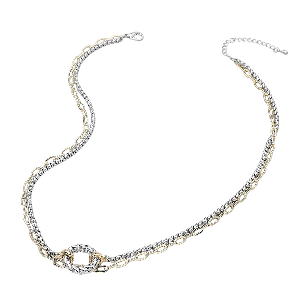 Details • Necklace Size : 17" + 2" L • Decor Size : 0.75" L • Elegant layered chain link necklace featuring a dual-strand design with fine and bold links joined by a textured circle accent. Lightweight and versatile, this mixed-metal style adds dimension and shine to everyday or evening looks. Perfect for gifting or elevating any outfit. • Gold Dipped