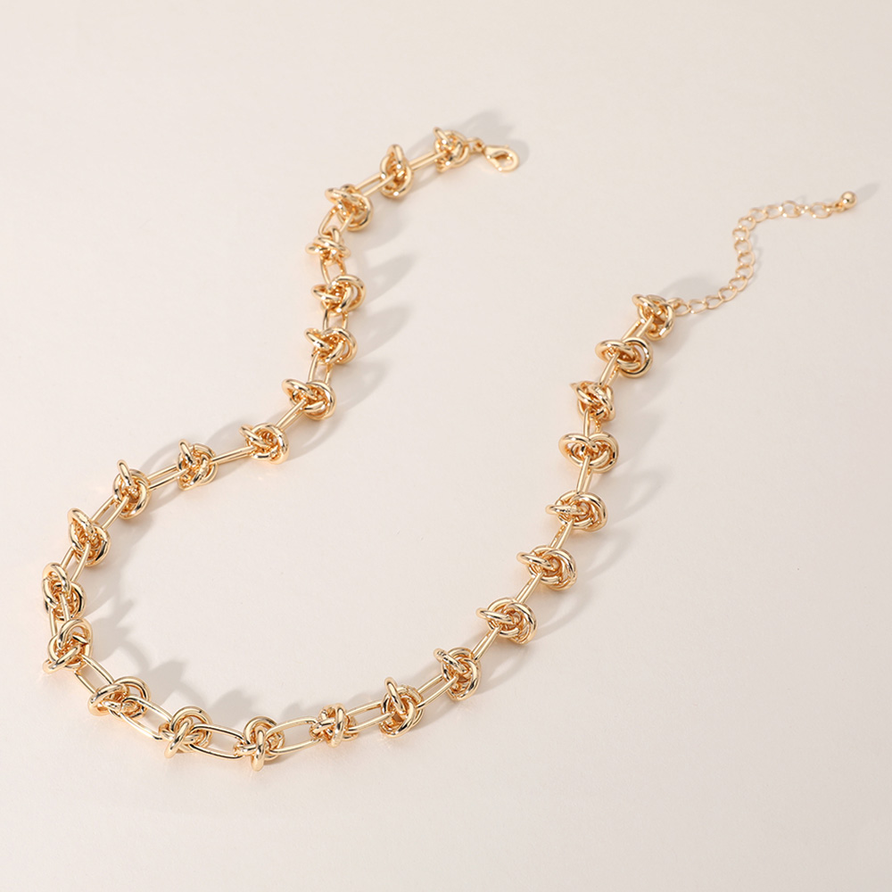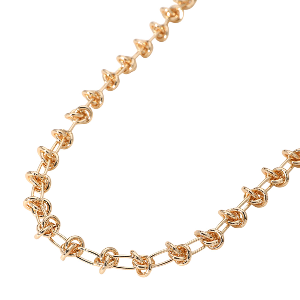 Details • Necklace Size : 16" + 3" L • Decor Size : 0.4" L • Stylish knot link chain necklace featuring interwoven knot-shaped links for a bold and modern design. Perfect for adding texture and detail to any outfit, whether layered or worn as a standalone accessory. • Made In Korea • Gold Dipped