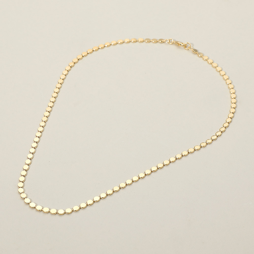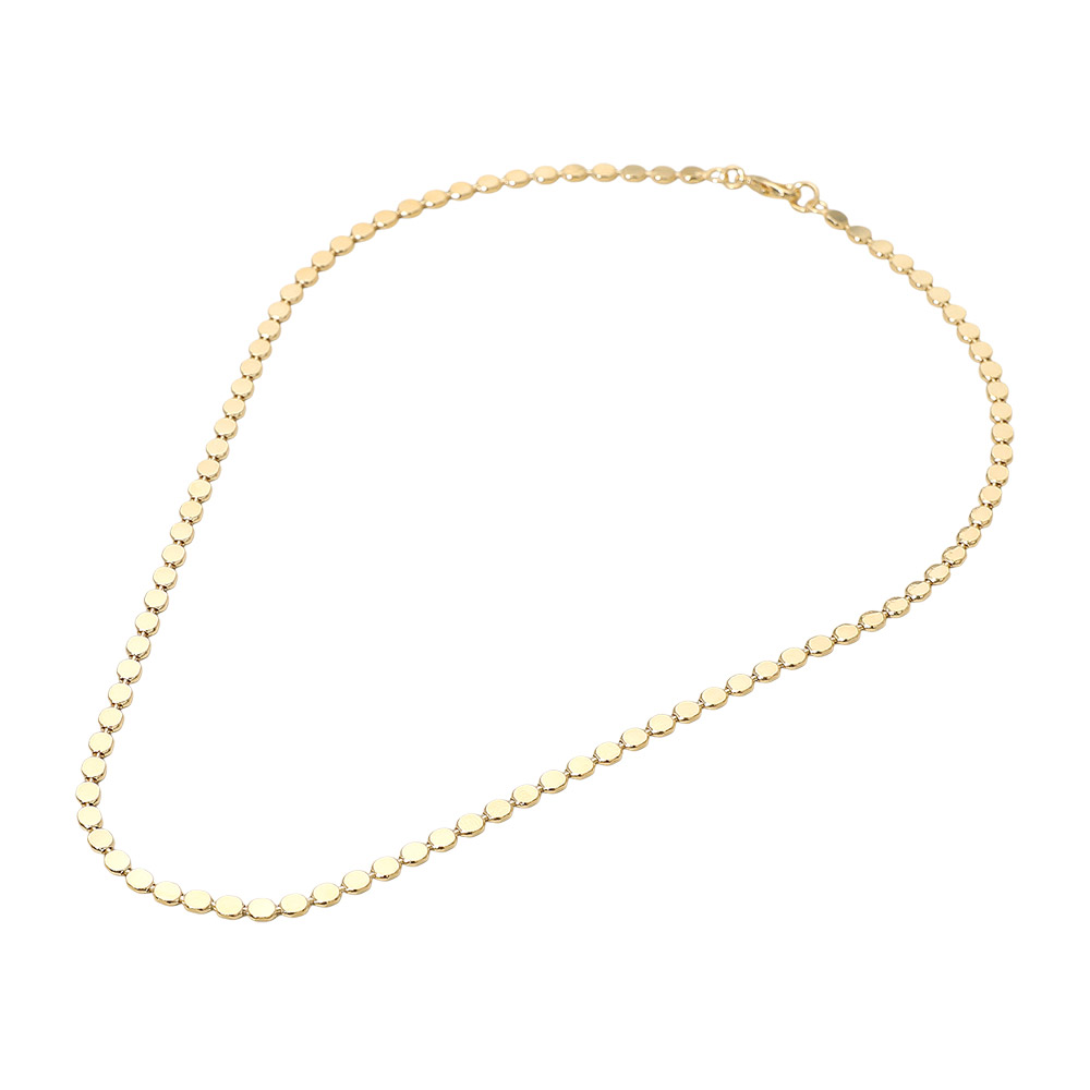 Details • Necklace Size : 16" L • Decor Size : 0.1" L (3mm) • Elegant flat disc chain necklace designed with smooth, reflective round links that create a brilliant shimmer. A statement piece that adds modern sophistication, perfect for both casual and formal wear or as a layering essential. • Gold Filled • Lead and Nickel Compliant • Made In Brazil