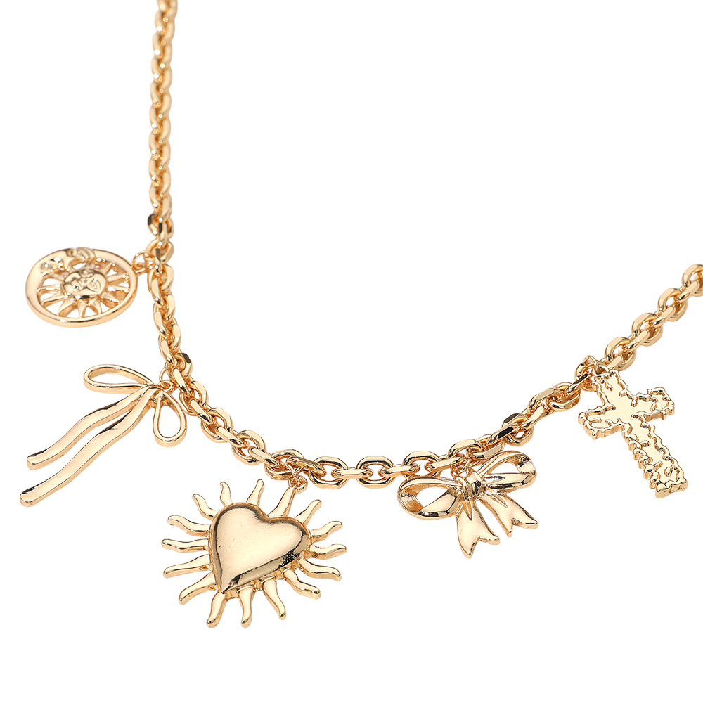 Details • Size : 15" + 3.25" L • Decor Size : 1.75" L • Elevate your look with this elegant charm necklace featuring a radiant heart, delicate bows, and symbolic accents. The detailed gold-tone design adds a chic, feminine touch that transitions seamlessly from day to night, making it a perfect statement accessory or thoughtful gift. • Lead and Nickel Compliant