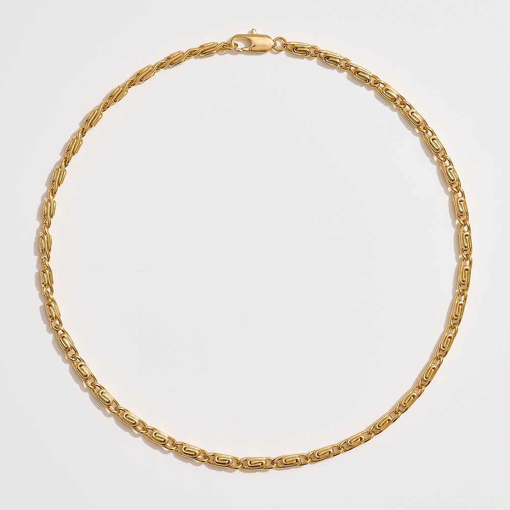 Details • Necklace Size : 18" + 1" L • Decor Size : 0.2" L • Make a bold statement with this byzantine chain necklace featuring intricately interwoven links for a distinctive, textured look. A timeless design that balances elegance and strength, perfect for wearing alone or layering, adding sophistication to both casual and dressy outfits. • Brass • Gold Dipped • Hypoallergenic • Made In Korea