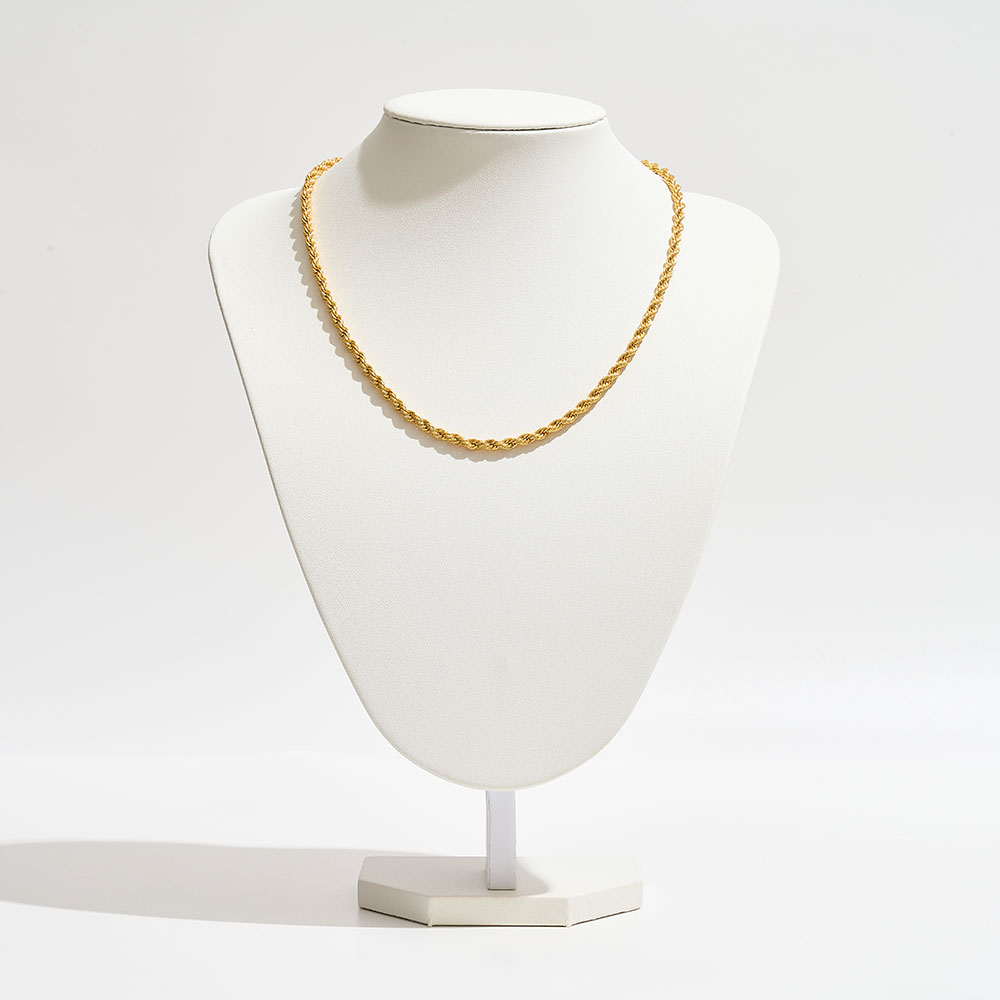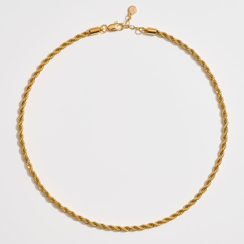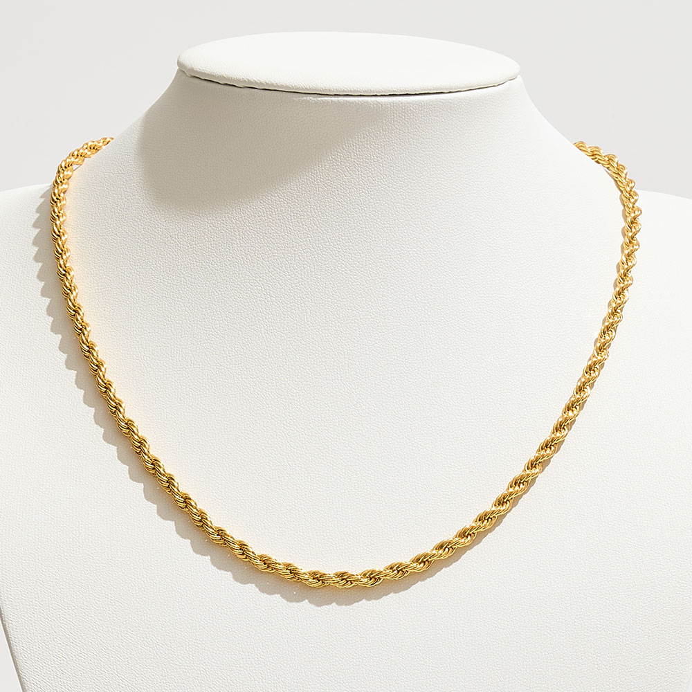 Details • Necklace Size : 18" + 1" L • Decor Size : 0.2" L • Add timeless elegance with this rope chain necklace featuring twisted interwoven links for a textured, dimensional look. A versatile piece that shines on its own or layered with other necklaces, it transitions seamlessly from casual to formal wear, making it a jewelry collection essential. • Brass • Gold Dipped • Made In Korea
