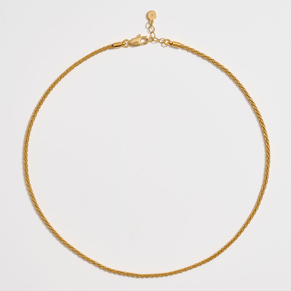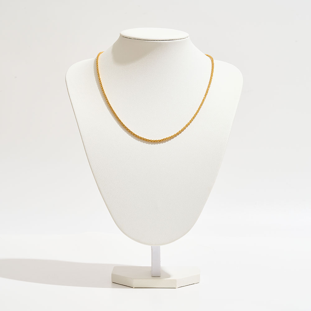 Details • Necklace Size : 16" + 1" L • Decor Size : 0.2" L • Elevate your style with this slim rope chain necklace, crafted with delicate twists that add refined texture and shine. Lightweight and versatile, it’s the perfect piece for layering or wearing alone, offering timeless sophistication for both casual and formal looks. • Hypoallergenic • Made In Korea • Gold Dipped • Brass