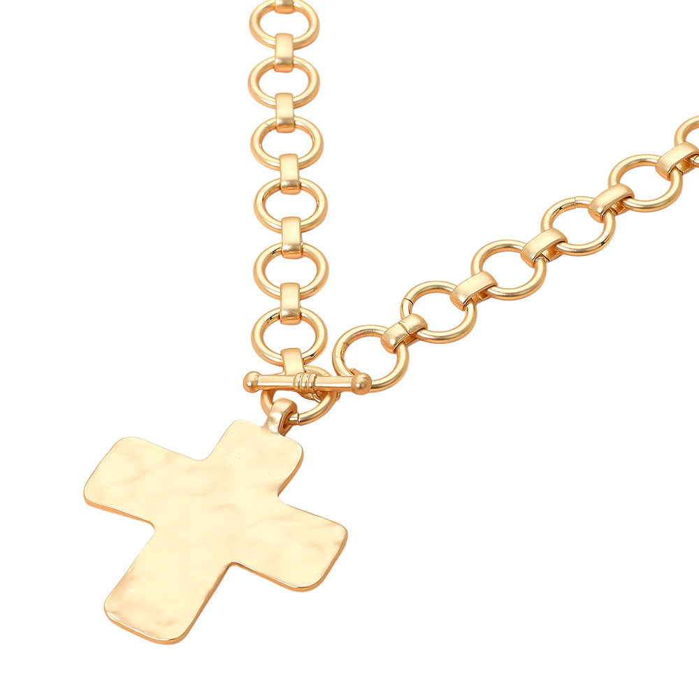 Hammered Matte Metal Cross Pendant Chunky Chain Toggle Necklace