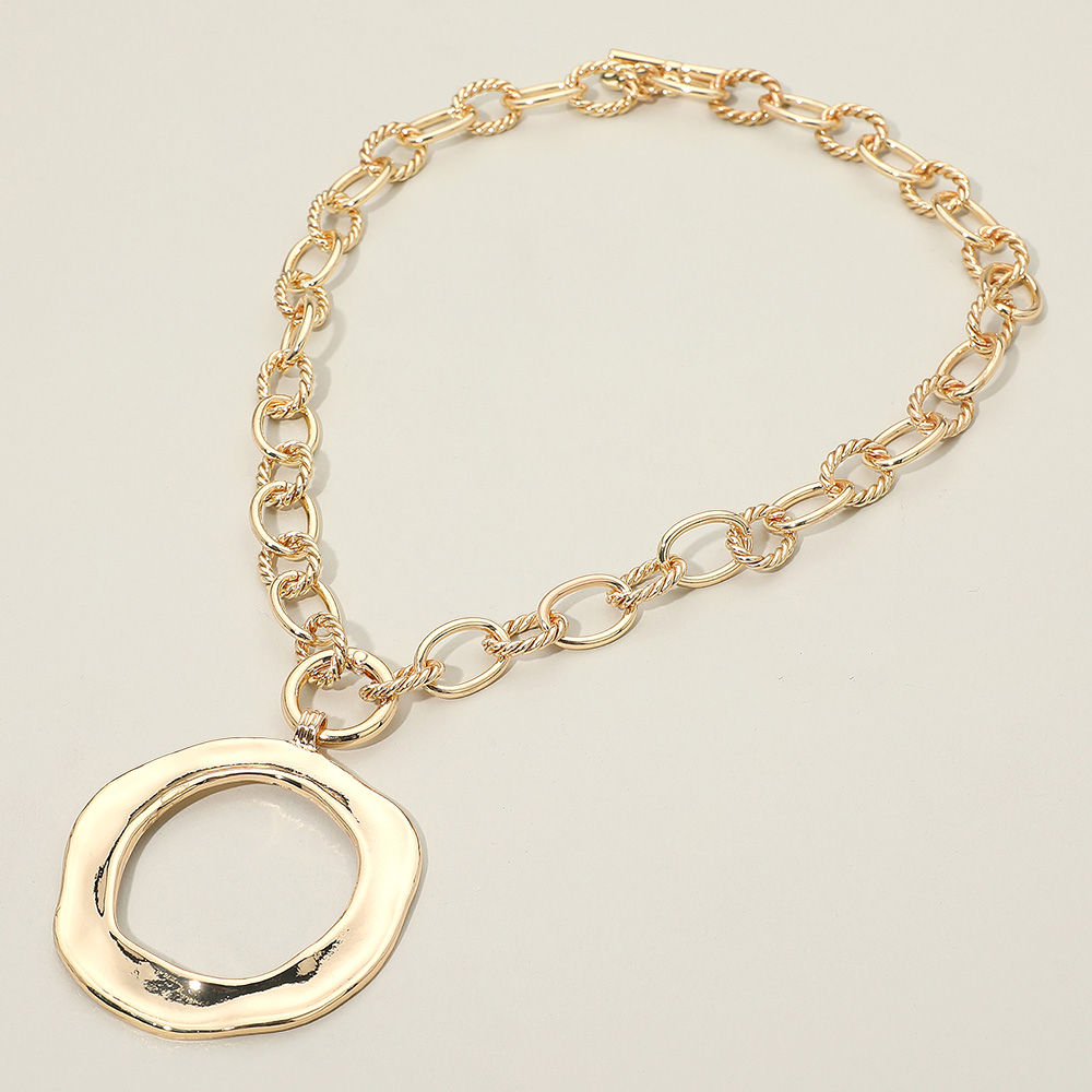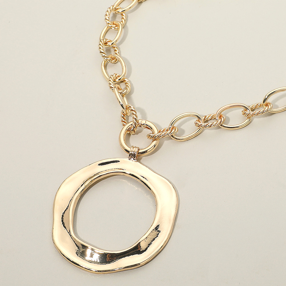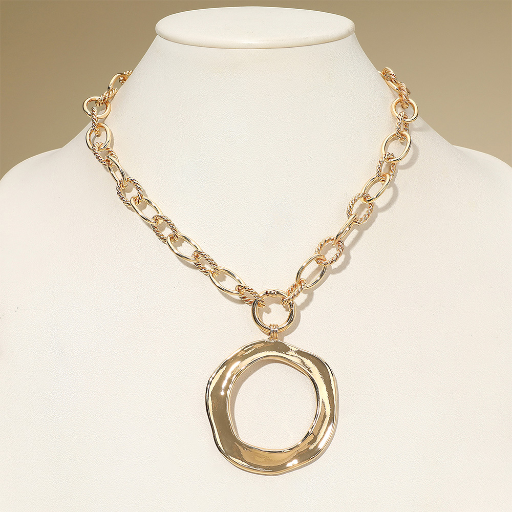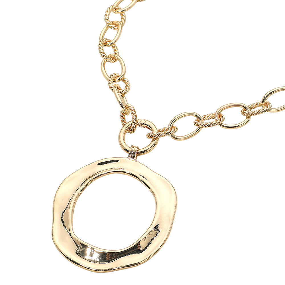 Details • Necklace Size : 18" + 0.5" L • Pendant Size : 2.1" X 3" • This elegant chain necklace features a sculpted circular pendant paired with textured interlocking links for a bold yet refined look. Perfect for adding a modern statement to everyday wear or evening outfits, this piece blends simplicity with artistic sophistication. • Lead and Nickel Compliant