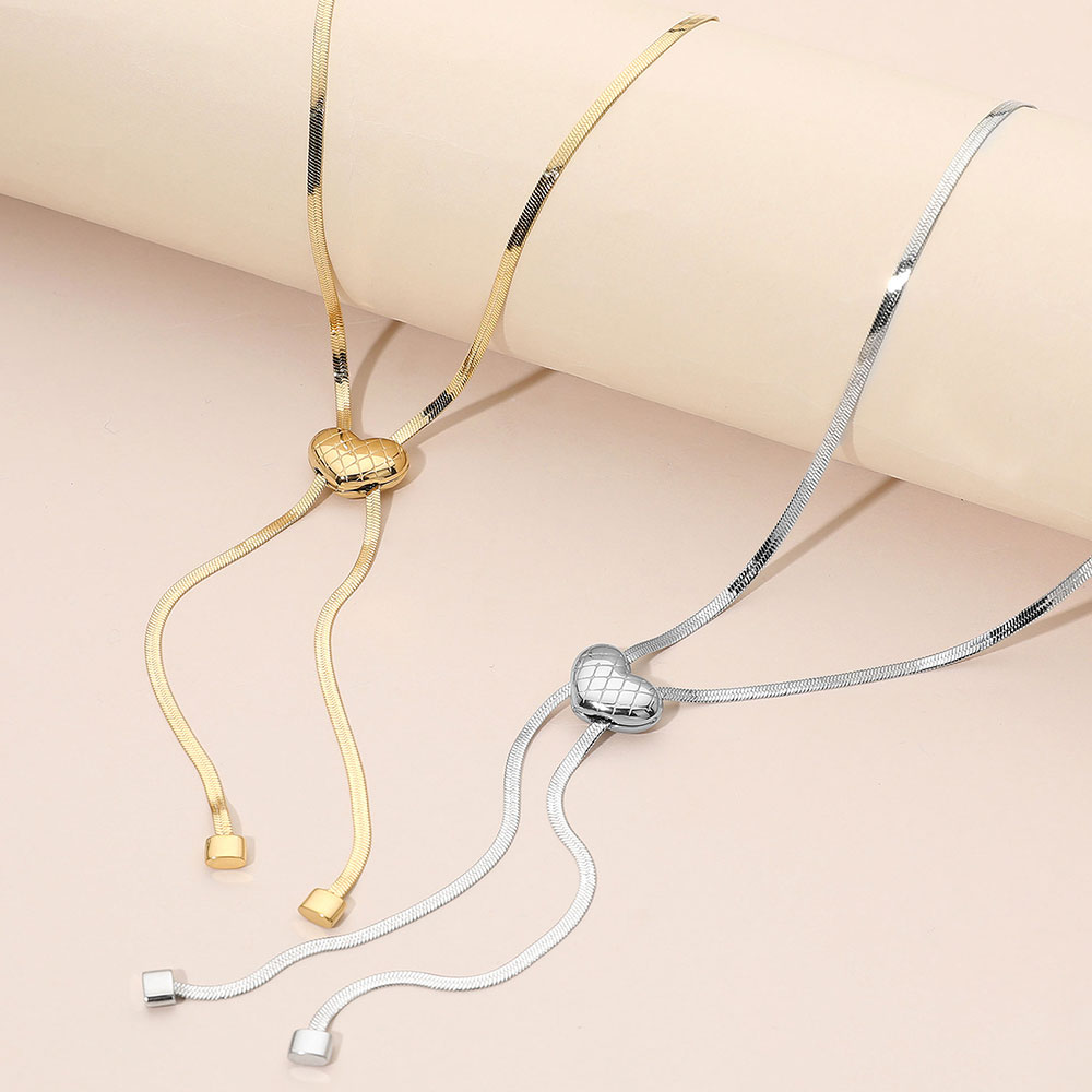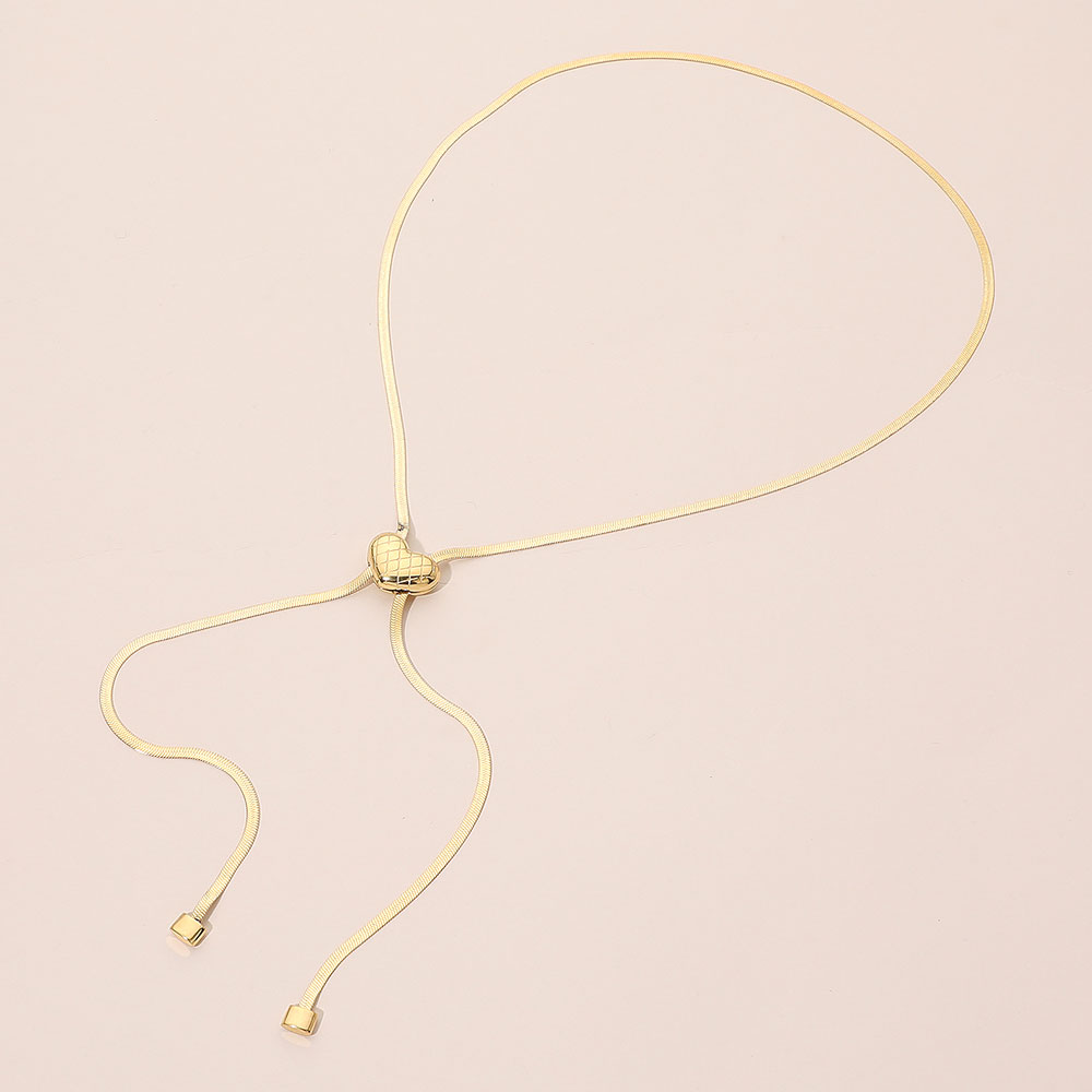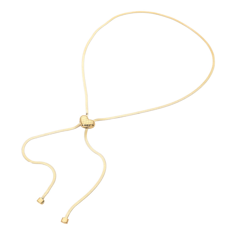 • Elegant slider necklace featuring a textured heart accent and fluid drop-chain design that adjusts for a custom fit. Perfect for minimalist styling or layered looks, it transitions effortlessly from everyday wear to evening outfits, delivering subtle movement and timeless statement appeal in a sleek silhouette.
