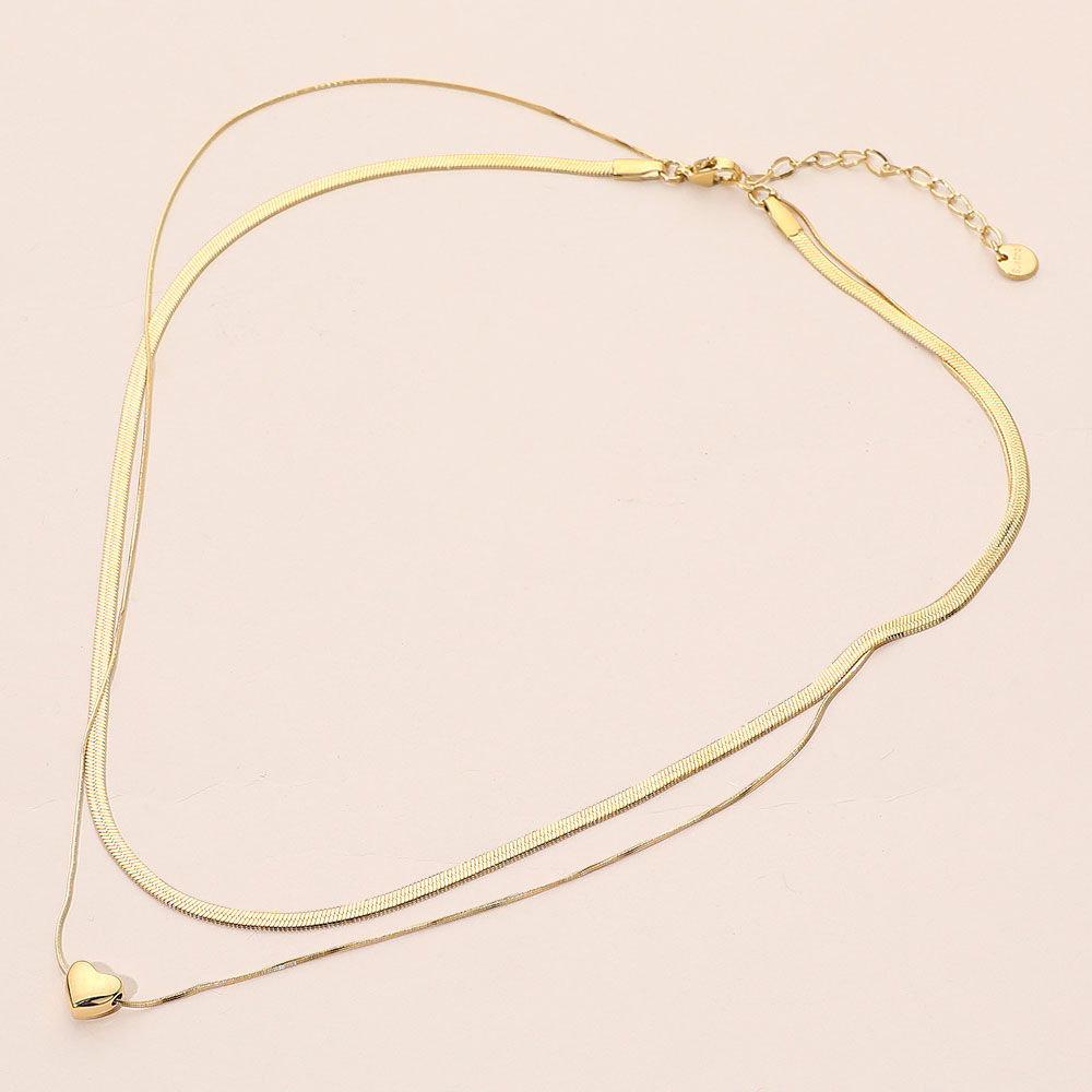 Details • Necklace Size : 15.5" + 2" L • Decor Size : 1.75" L • Water Resistant • Elegant layered necklace featuring dual chains and a delicate heart pendant for modern, effortless styling. Designed to elevate everyday outfits or complement evening looks, it adds dimension and subtle movement, perfect for solo wear or pairing with other statement pieces for a chic finish. • Hypoallergenic • Stainless Steel