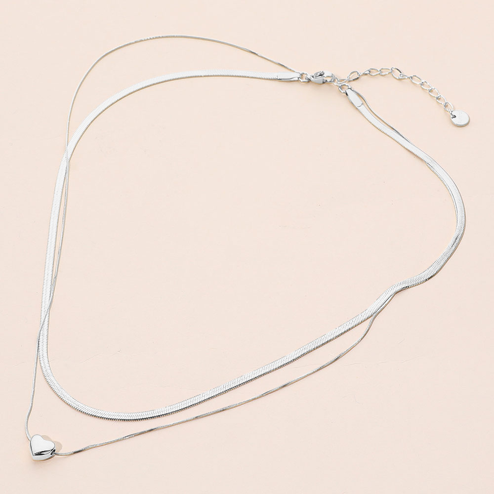 SECRET BOX_Stainless Steel Heart Pendant Accent Herringbone Chain Layered Necklace