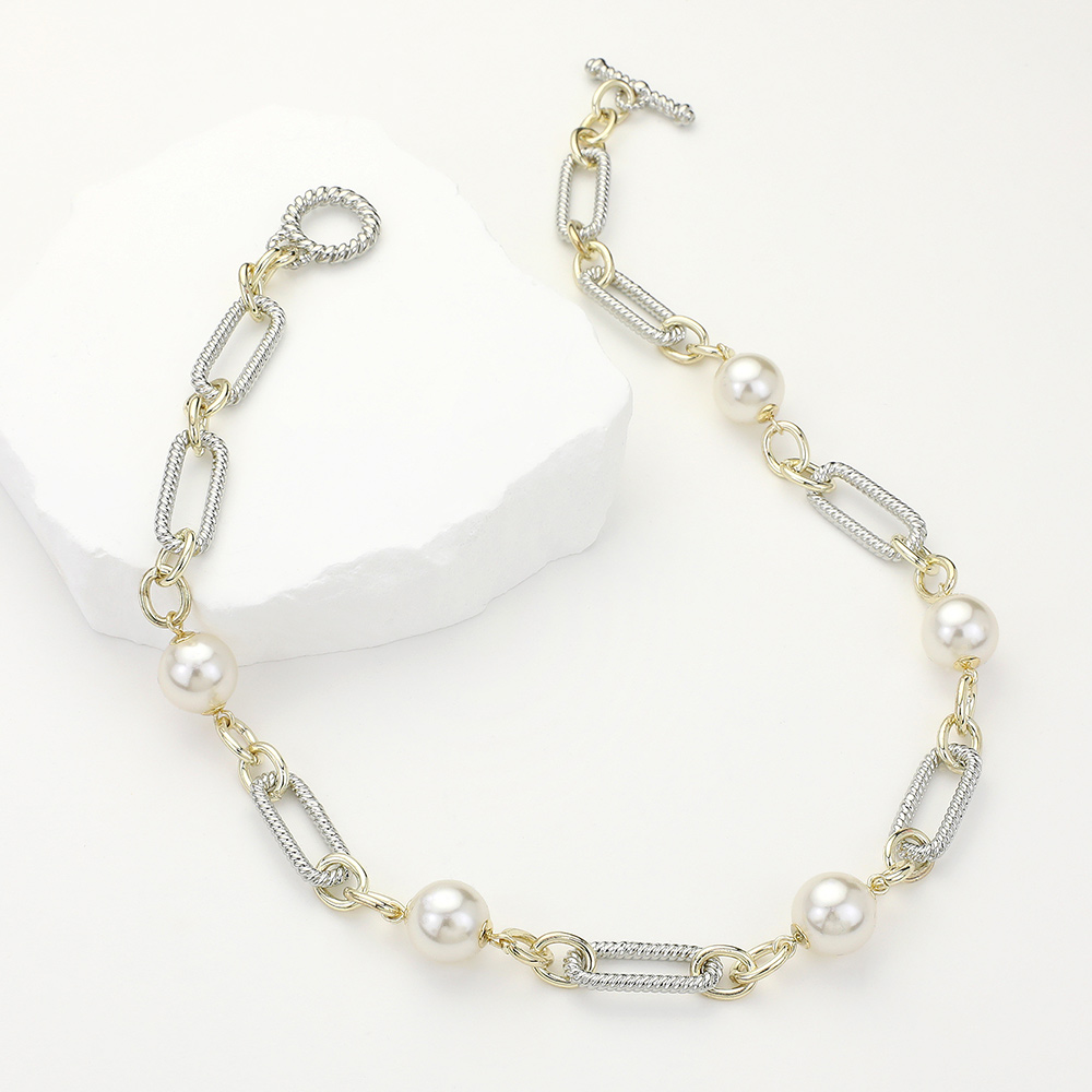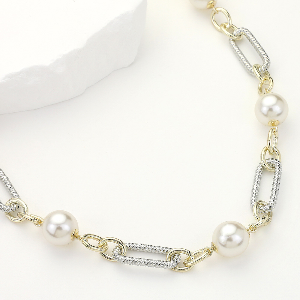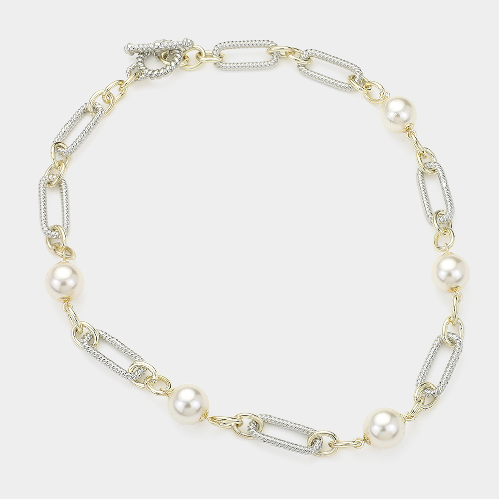 • Chic necklace featuring glossy pearls and dual-tone textured chain links. A perfect balance of sophistication and modern edge for any ensemble.