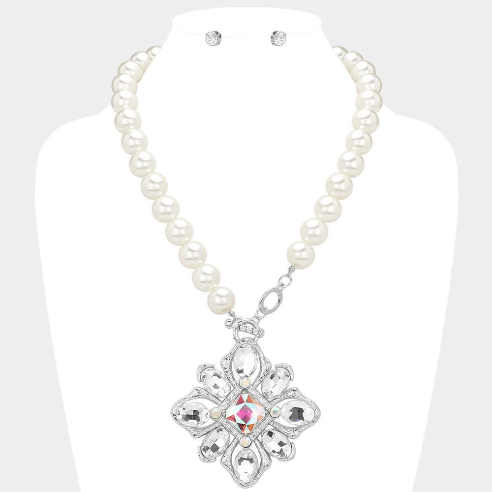 Details • Necklace Size : 21" + 1" L • Pendant Size : 3.25" X 3.25" • Earrings Size : 0.3" L • Toggle Closure • Turn heads with this stunning pearl necklace featuring an ornate gemstone pendant and matching stud earrings. The bold centerpiece blends classic elegance with a dramatic flair, making it the perfect accessory for upscale events, evening wear, or standout looks. • Lead and Nickel Compliant