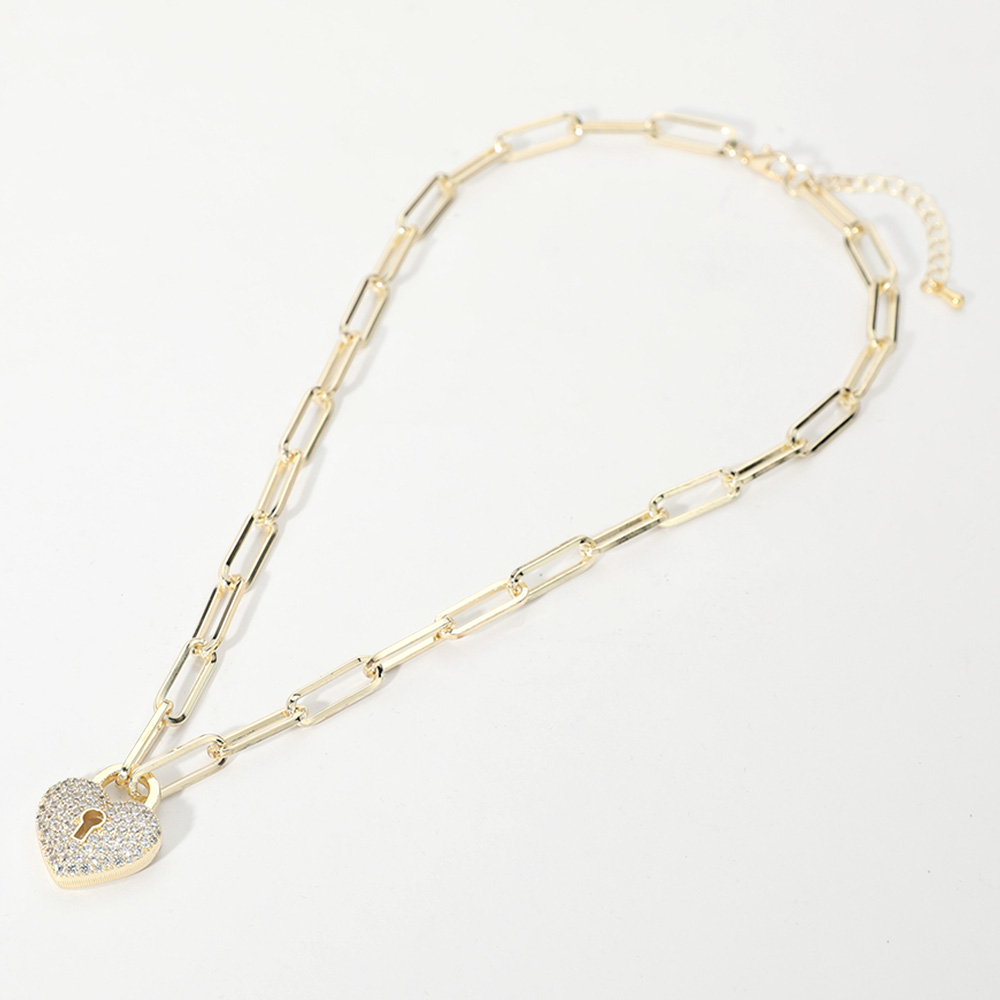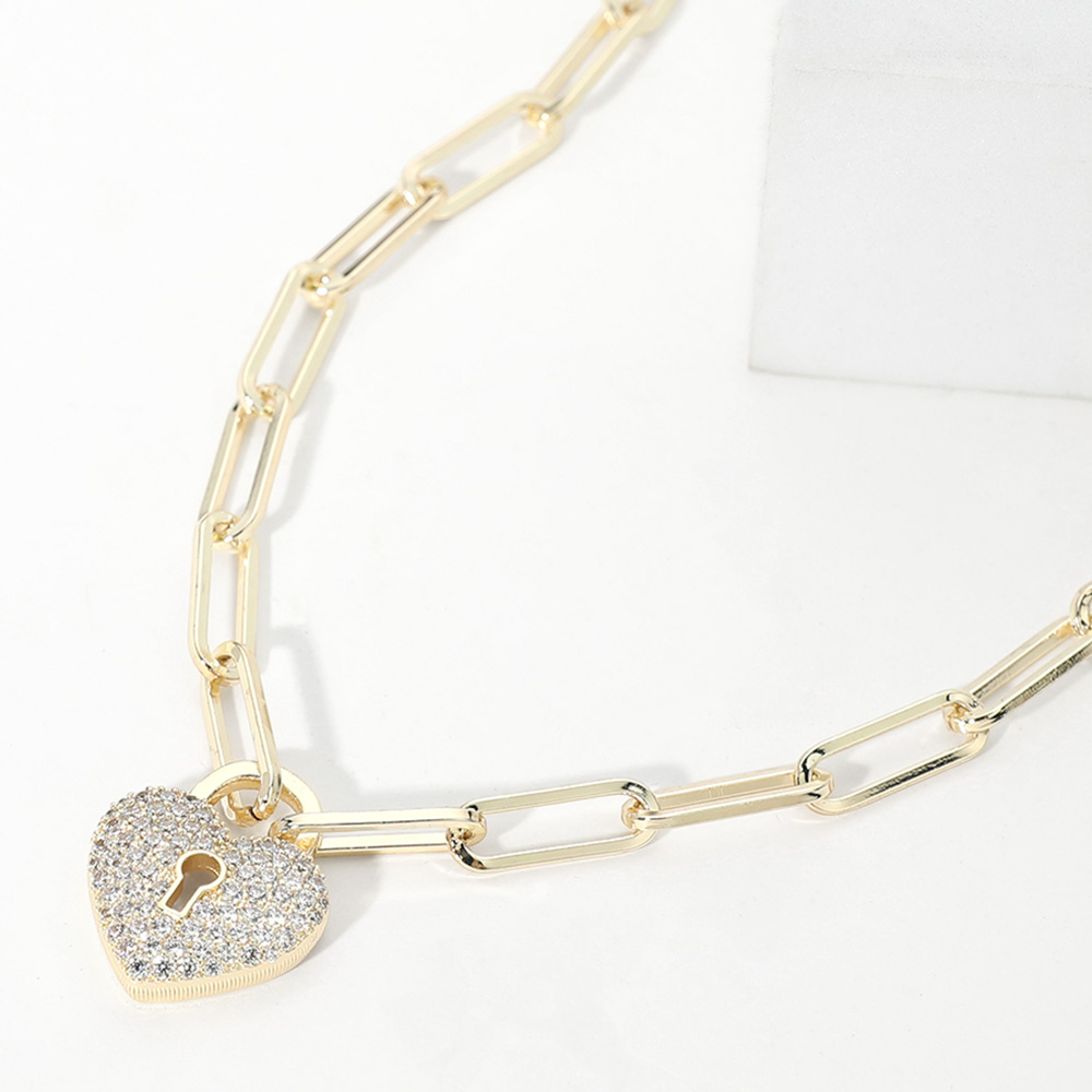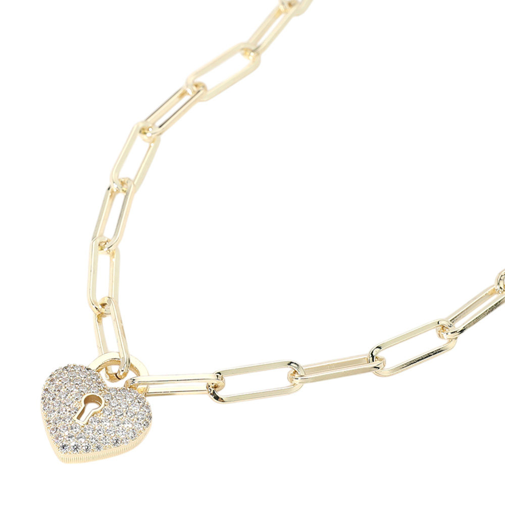14K Gold Plated CZ Stone Paved Heart Lock Pendant Paperclip Chain Necklace