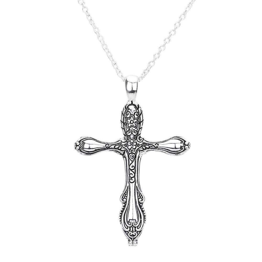 Brushed Hammered Metal Cross Pendant Paperclip Chain Toggle Necklace
