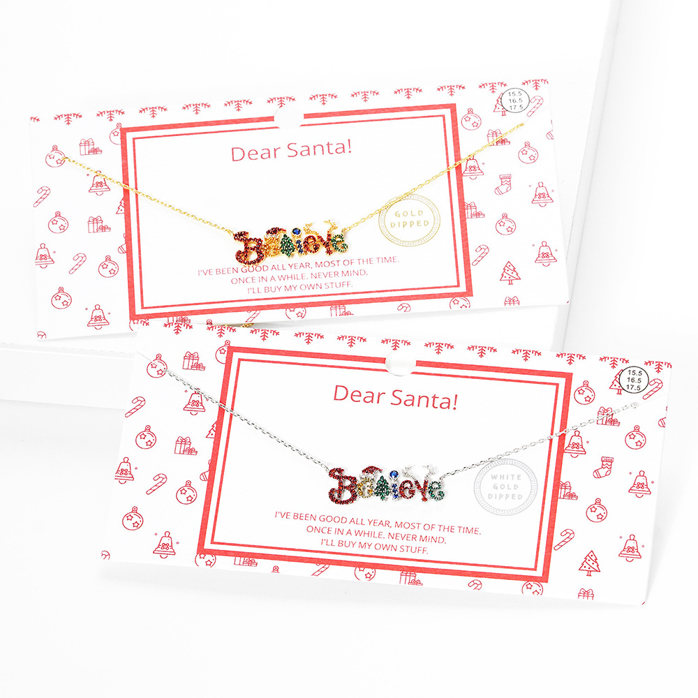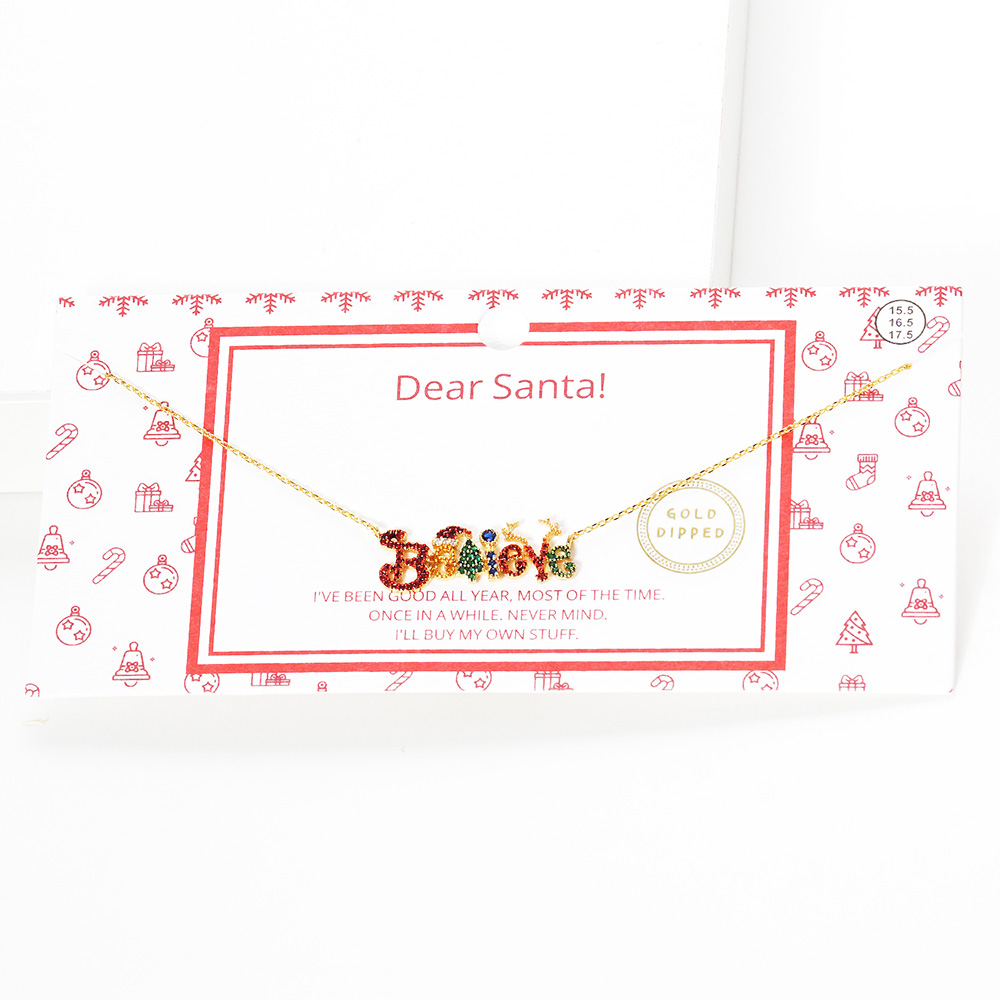Believe Gold Dipped CZ Santa Hat Reindeer Message Pendant Necklace