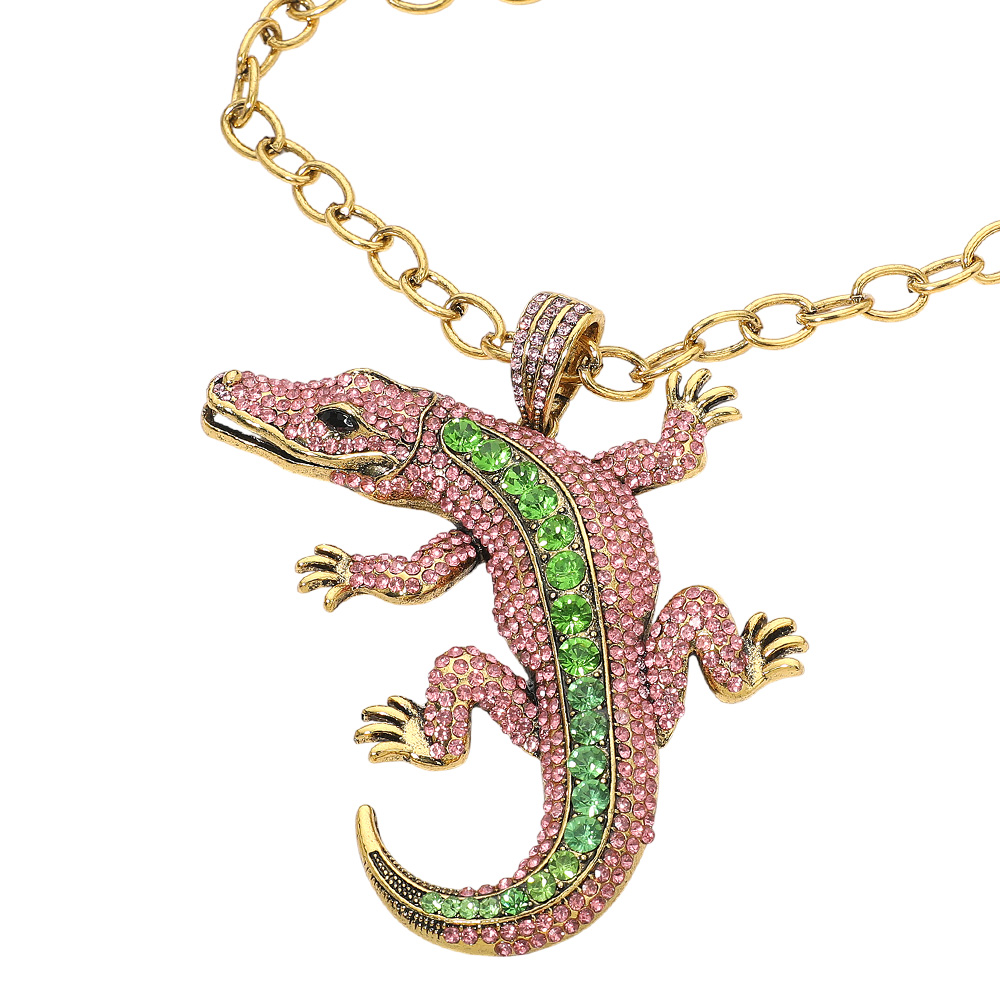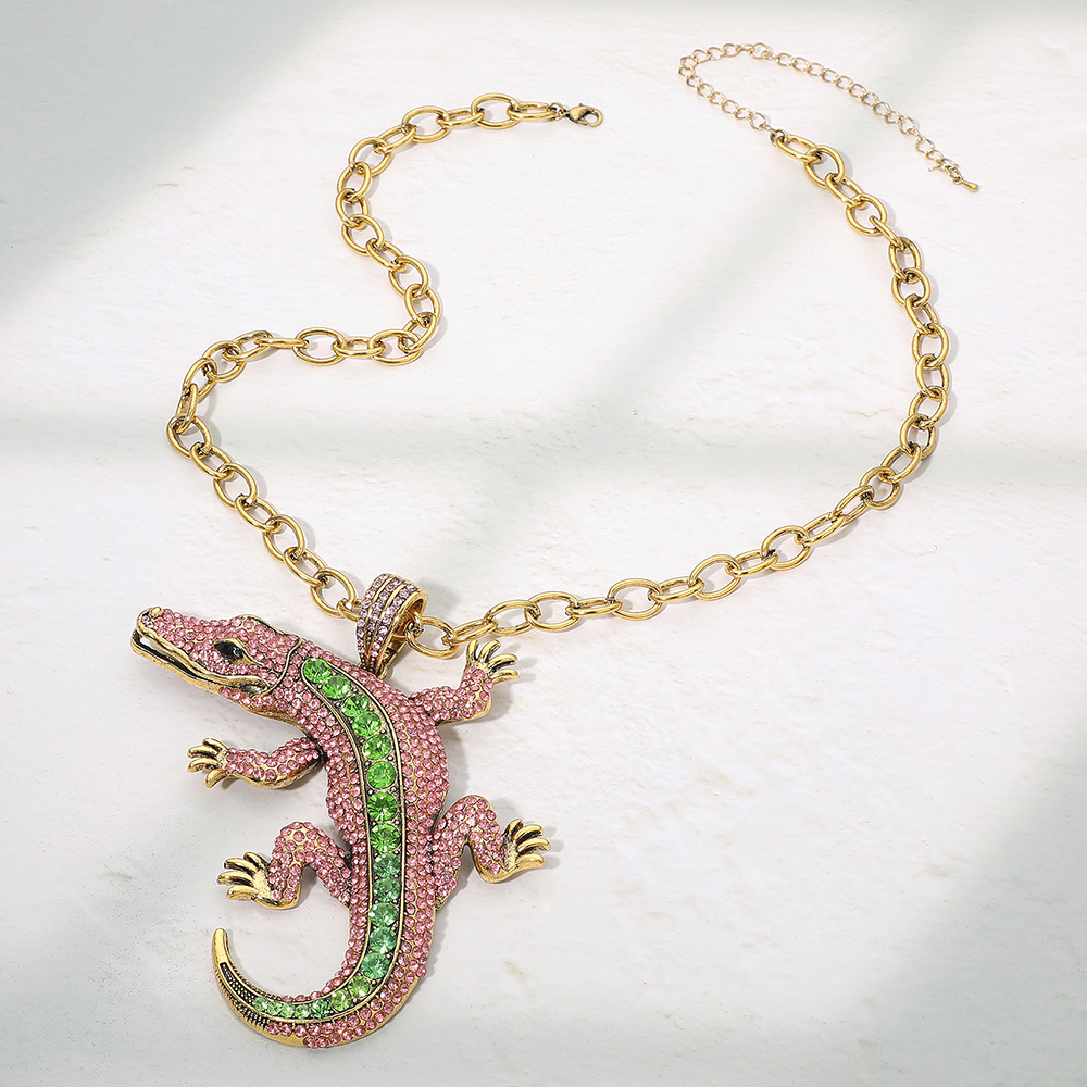 • Bold alligator pendant necklace with shimmering accents on a chunky chain. This statement jewelry piece combines edgy charm with artistic flair, perfect for fashion-forward looks or themed events, adding a fierce and captivating touch to any stylish outfit.