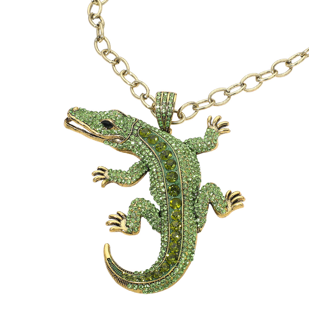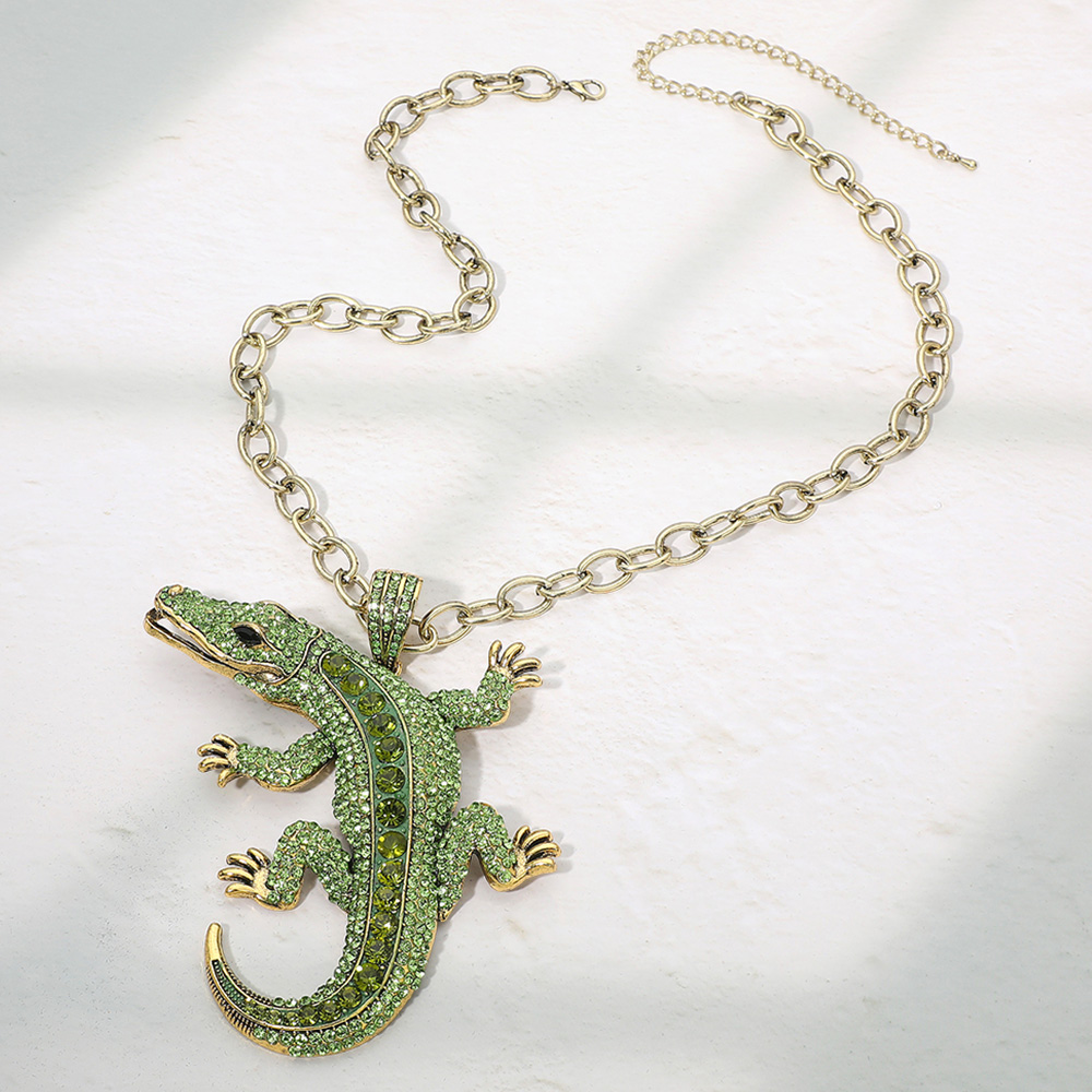 Details • Necklace Size : 22.5" + 5.5" L • Pendant Size : 3.25" X 4.25" • Bold alligator pendant necklace with shimmering accents on a chunky chain. This statement jewelry piece combines edgy charm with artistic flair, perfect for fashion-forward looks or themed events, adding a fierce and captivating touch to any stylish outfit. • Lead and Nickel Compliant