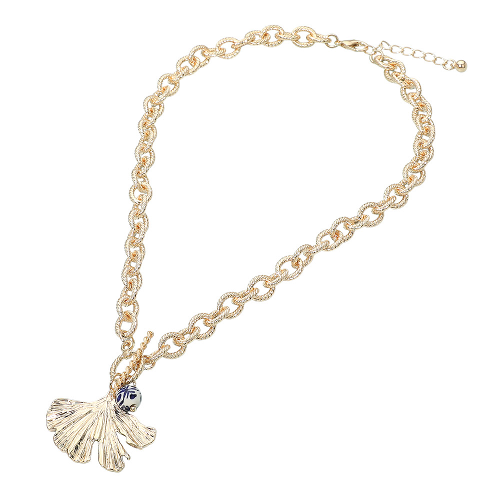 Details • Necklace Size : 17" + 1.5" L • Pendant Size : 1.5" X 1.2" • Statement necklace featuring a textured chain paired with a sculptural ginko leaf charm pendant and decorative accent bead. Designed to stand out worn alone or layered, this piece brings artistic detail and boutique appeal to everyday looks, seasonal collections, and trend-driven accessory assortments. • Lead and Nickel Compliant