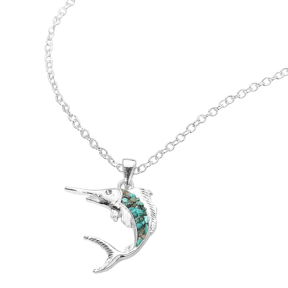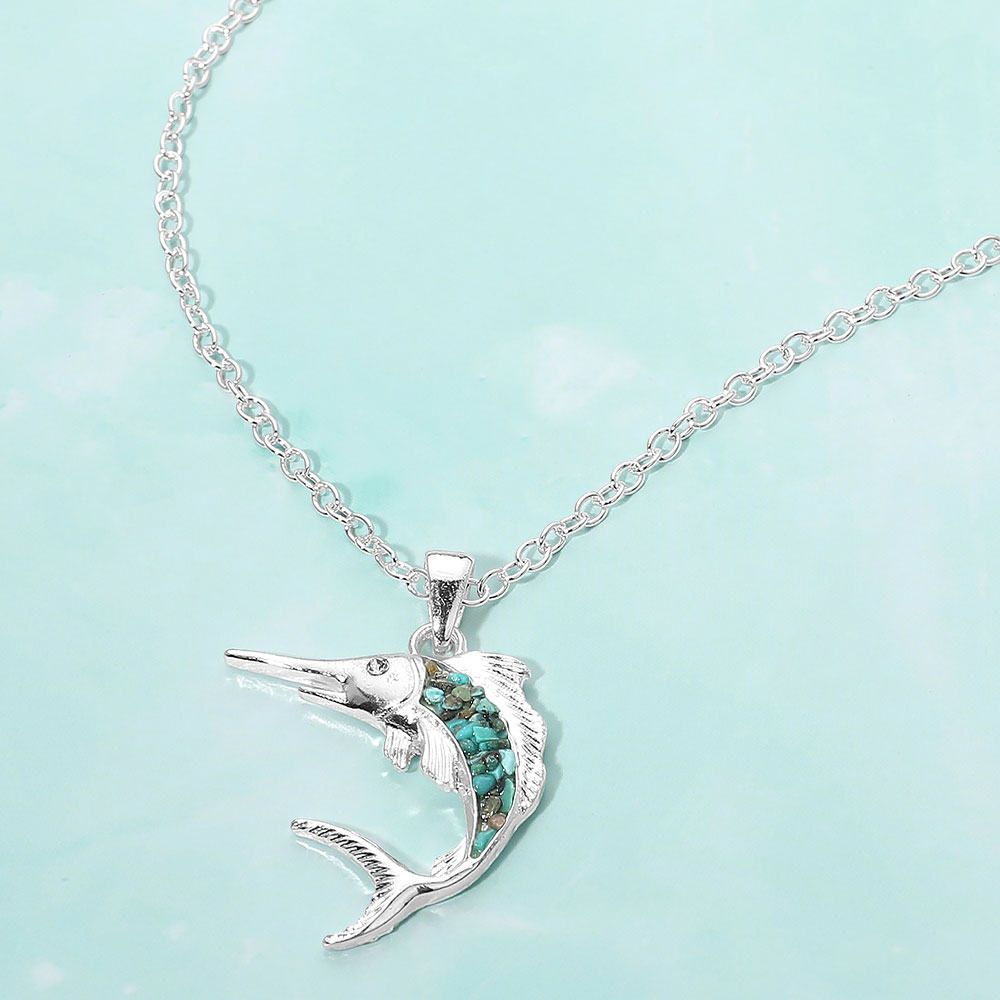 Details • Necklace Size : 18" + 3.5" L • Pendant Size : 1.4" X 1.8" • Swordfish pendant necklace featuring a dynamic ocean-inspired silhouette with textured inlay detail. Designed to stand out in summer and coastal collections, this eye-catching piece is ideal for beach boutiques, resort shops, and gift assortments, adding bold nautical character and strong visual appeal to seasonal jewelry displays. • Lead and Nickel Compliant