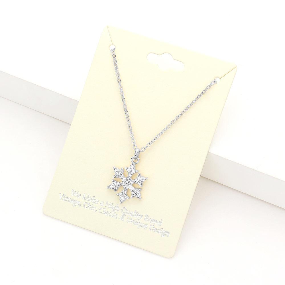 Details • Necklace Size : 16" + 2" L • Pendant Size : 0.6" X 0.75" • This snowflake pendant necklace shines with sparkling accents, capturing the beauty of winter in a timeless design. A delicate and versatile piece, perfect for adding a touch of seasonal charm to everyday outfits or gifting as a symbol of uniqueness. • Lead and Nickel Compliant