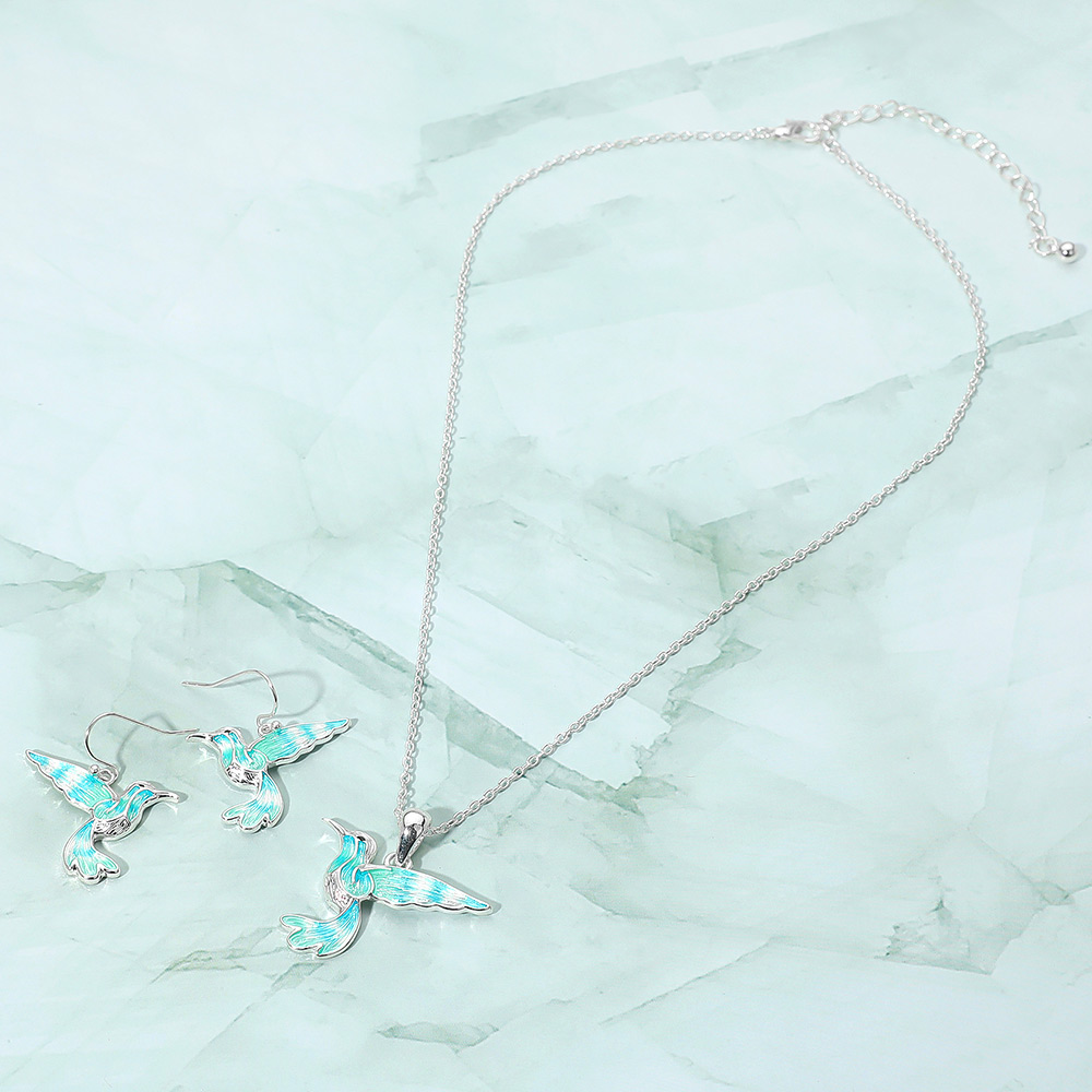 Details • Necklace Size : 18" + 3.25" L • Pendant Size : 1.25" X 1.25" • Earrings Size : 1.25" L • This hummingbird enamel necklace and earring set captures the grace and vitality of nature’s most delicate flyer. Designed with intricate details, it symbolizes joy and lightness, adding an elegant touch to your look. Perfect for everyday wear or as a meaningful gift choice. • Lead and Nickel Compliant