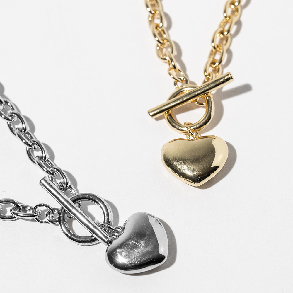 Details • Necklace Size : 18" + 1" L • Pendant Size : 0.7" X 0.5" • Elevate your everyday style with this toggle heart charm chain necklace featuring a smooth, polished pendant on a bold link chain. Its chic, modern design pairs effortlessly with any outfit, making it a perfect accessory for layering or wearing solo. A stylish gift choice for any occasion. • Gold Dipped • Lead and Nickel Compliant • Made In Korea
