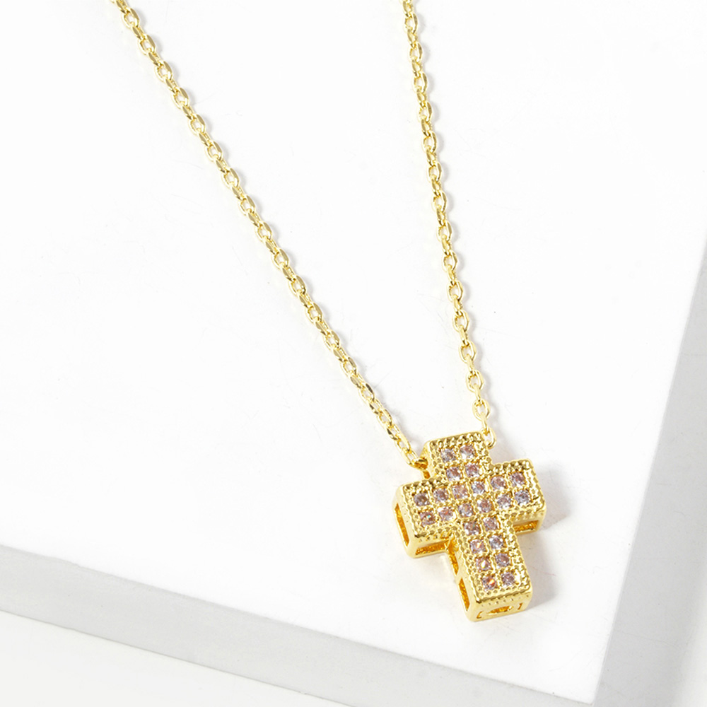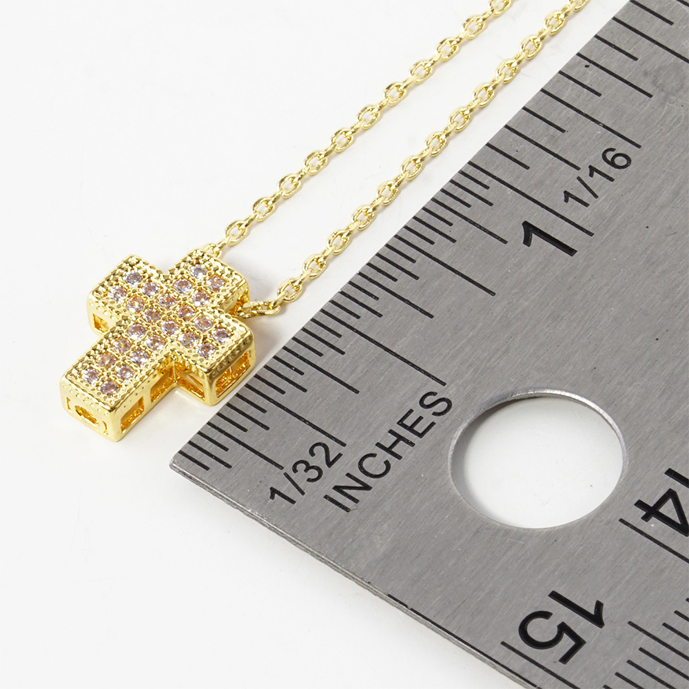 Details • Necklace Size : 15.5" + 2" L • Pendant Size :0.25" x 0.3" • Classic cross pendant necklace adorned with sparkling pave accents on a delicate chain. A meaningful and stylish piece that adds timeless elegance, perfect for everyday wear or special gifting occasions. • Lead and Nickel Compliant • Made In Korea • Gold Dipped • CZ Cubic Zirconia